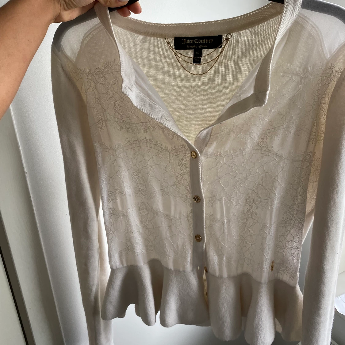 En riktig favorit .. säljer pga har ingen outfit till den. En fin stickad kofta från Juicy Couture. Använd men ser fortfarande väldigt lyxig och snygg ut! Behövs strykas så blir den som ny 🥰💖✨