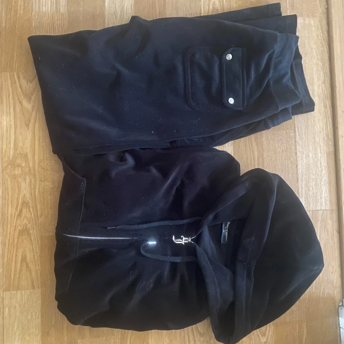 Säljer en supermjuk och bekväm svart velour hoodie från Juicy Couture. Perfekt för en avslappnad stil med dragkedja och huva. Den har en liten ficka med knappdetalj på framsidan. Passar perfekt för mysiga dagar hemma eller en casual dag ute. 🖤TRÖJAN ÄR S OCH BYXOR M