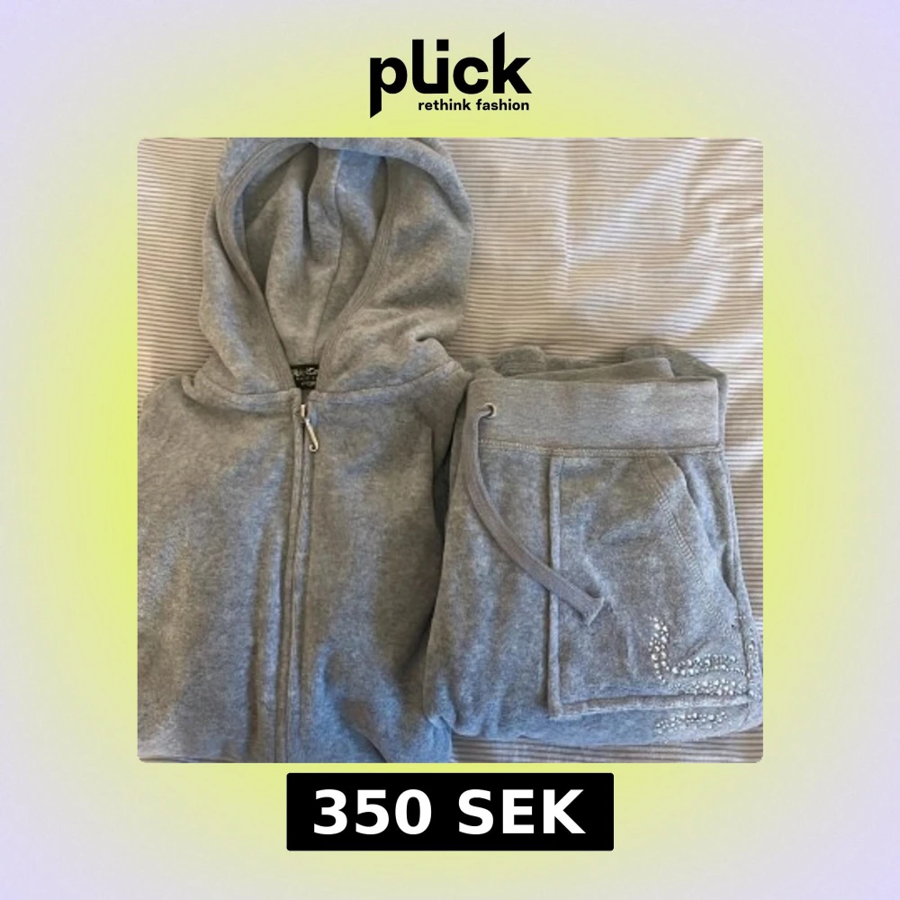 Säljer en grå hoodie och matchande byxor från Juicy Couture. Hoodien har dragkedja och en luva, medan byxorna har en praktisk ficka och dragsko i midjan. Båda plaggen är dekorerade med glittriga detaljer och texten 'Juicy Couture' på baksidan av hoodien.