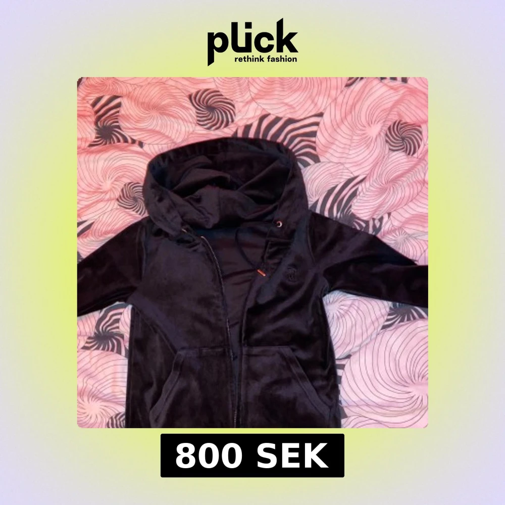 Svart velourjacka från Juicy Couture i storlek S. Jackan har huva med snörning, dragkedja framtill och två fickor. Mjuk och glansig yta med diskret logga på bröstet. Perfekt för en chill nästan oanvänd