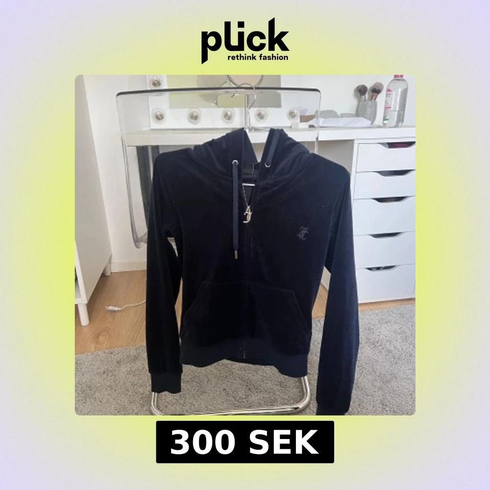 Mysig svart hoodie från Juicy Couture i mjuk velour med dragkedja framtill, huva med snörning och klassisk JC-logga på bröstet. Perfekt för en chill och avslappnad look.