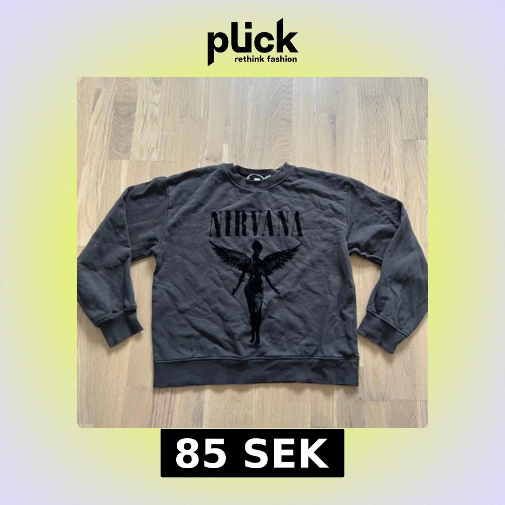 Cool grå/svart sweatshirt med Nirvana-tryck och ikonisk ängel på bröstet. Tröjan har rund hals, långa ärmar och ribbade muddar. Perfekt för dig som gillar bandmerch och vill ha en avslappnad stil.