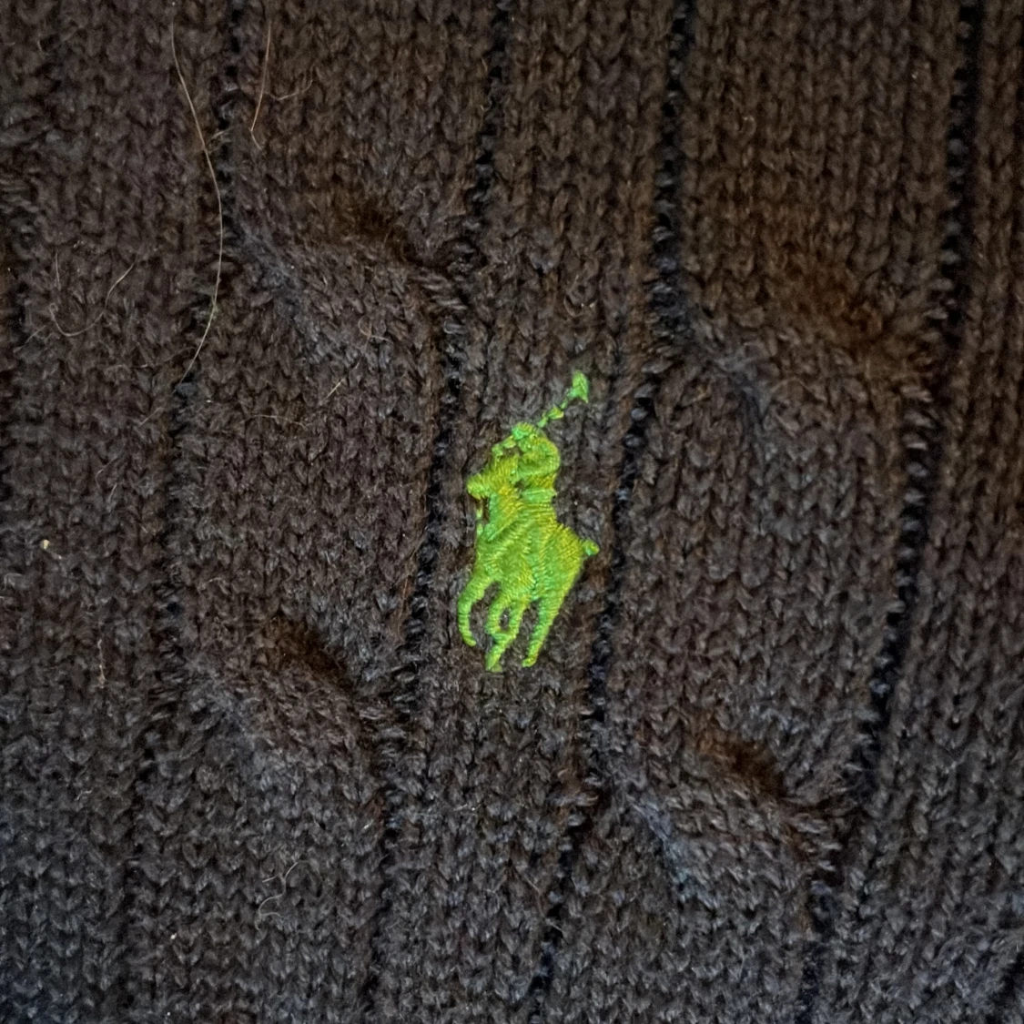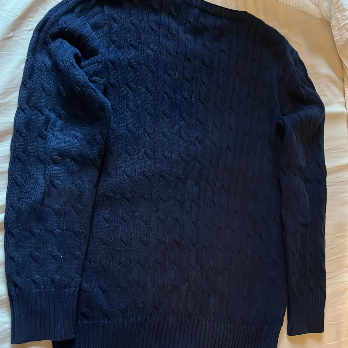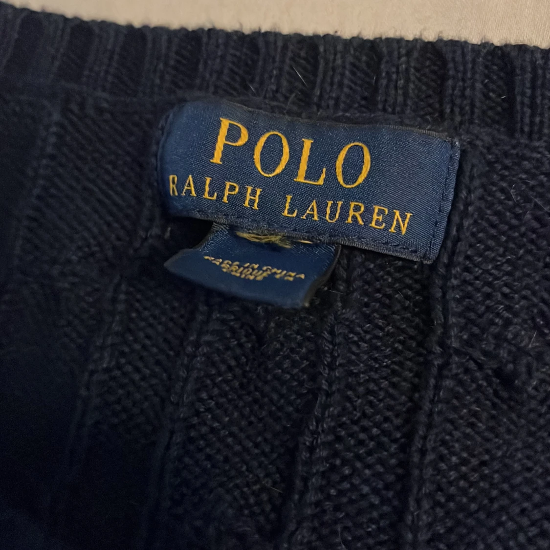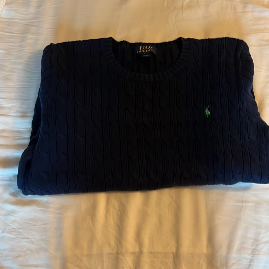 Kabelstickad mörkblå tröja från Polo Ralph Lauren med rund halsringning och grönt broderat logotyp på bröstet. Perfekt nu till vintern för dig som vill se fräsch ut;) storlek S passar dig som är 175-180 skick 9/10