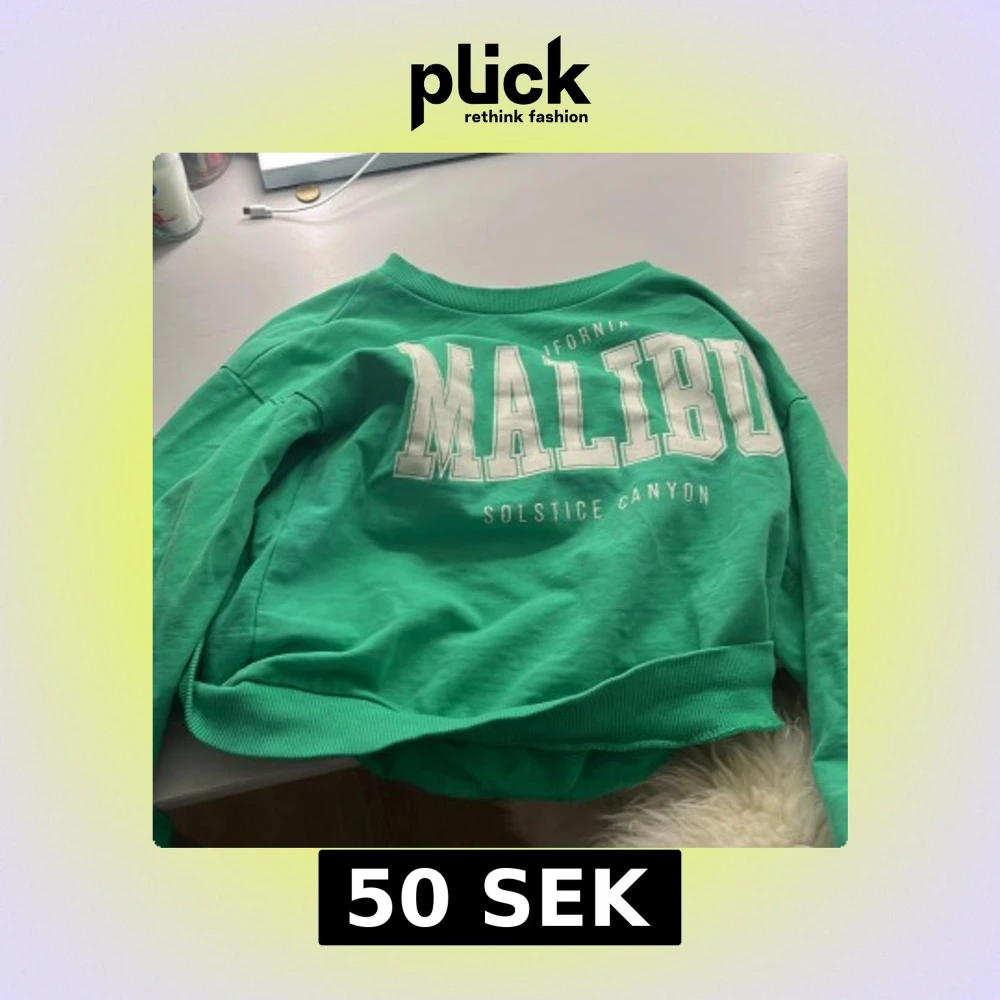 Säljer en grön sweatshirt från Kappahl med stort vitt tryck på ryggen där det står 'Malibu Solstice Canyon'. Tröjan har långa ärmar och ribbade muddar vid ärmslut och nederkant. Perfekt för en avslappnad stil.