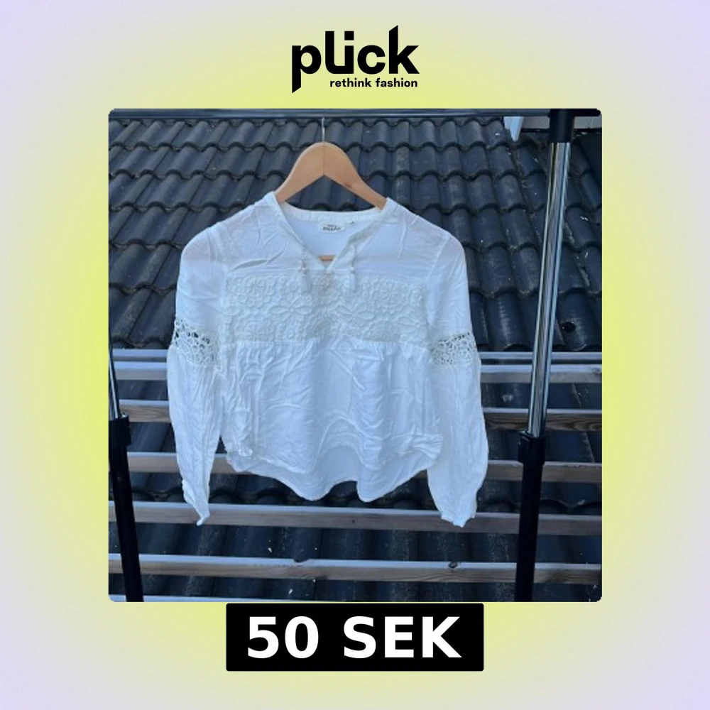 Supersöt vit blus från KappAhl med broderade spetsdetaljer och långärmade ärmar. Blusen har en avslappnad passform, rund halsringning och fina virkade partier på ärmar och bröst. Tillverkad i viskos och polyester för en lätt och luftig känsla.