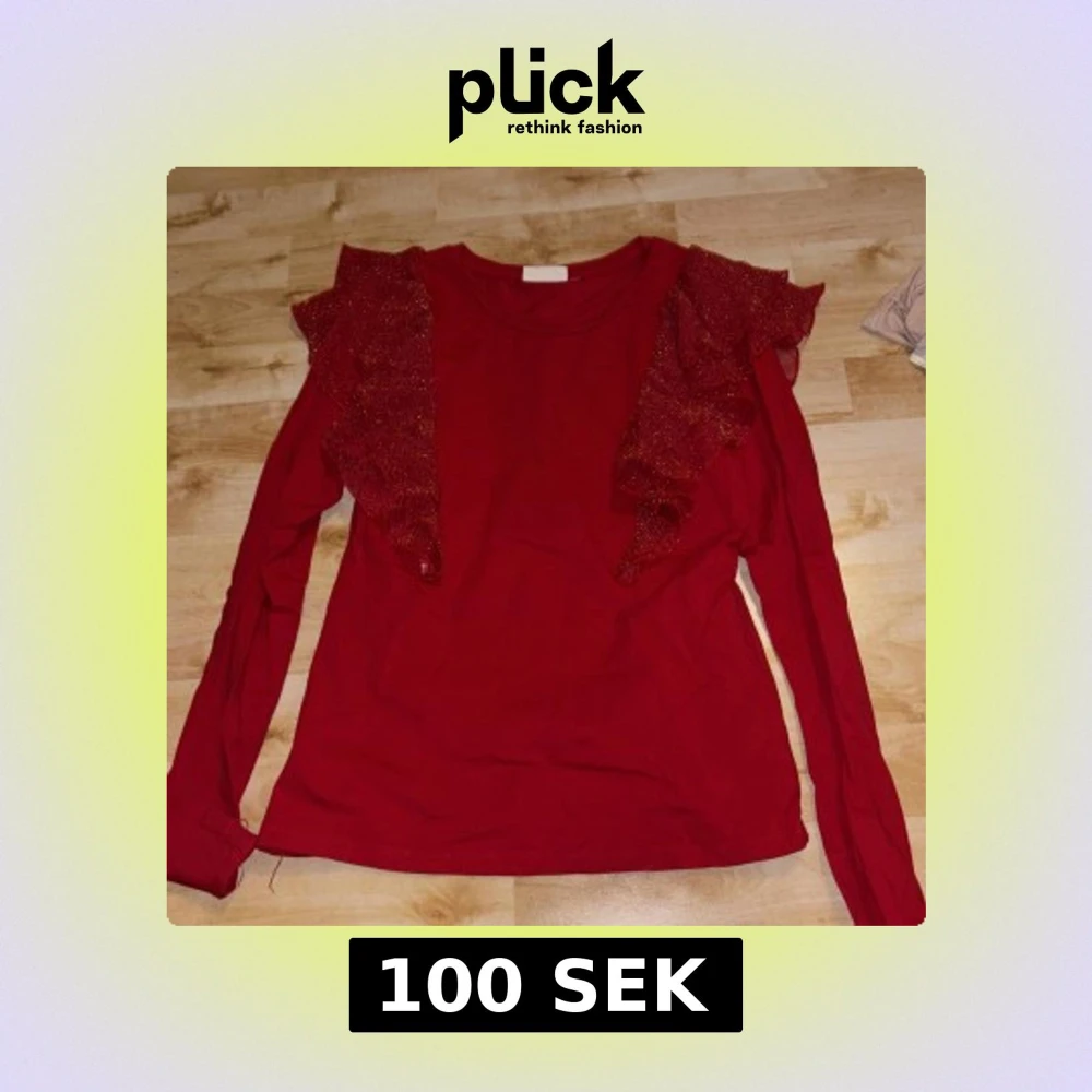 Snygg röd långärmad topp från KappAhl med glittriga volanger på axlarna. Perfekt för dig som vill sticka ut lite extra. Mjuk och skön bomullskänsla, rund halsringning och figurnära passform.