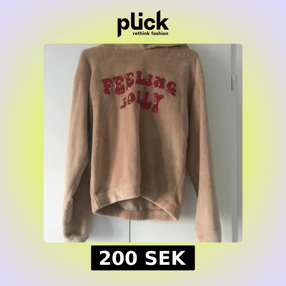 Mysig beige hoodie från Kappahl med texten 'Feeling Jolly' i röd glittrig stil på framsidan. Tröjan har en luva med en röd boll och dekorativa detaljer. Perfekt för kyliga dagar!