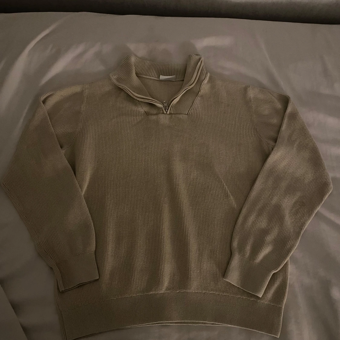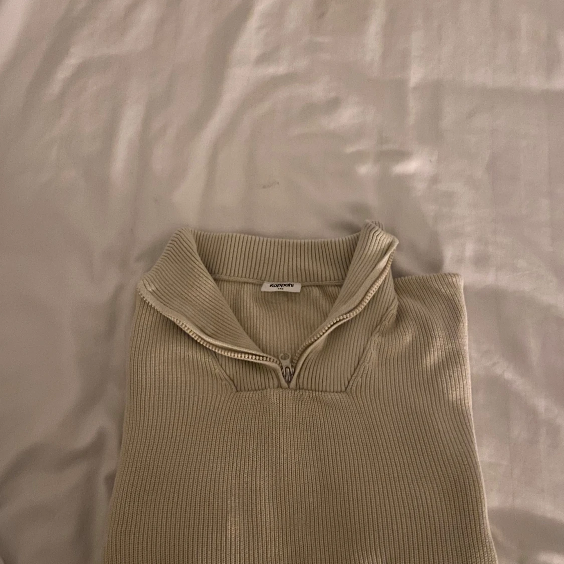 Säljer en beige stickad tröja från Kappahl med half zip-dragkedja och hög krage. Tröjan är ribbstickad och har långa ärmar samt breda muddar vid ärmslut och nederkant. Perfekt för lager-på-lager och chill stil.
