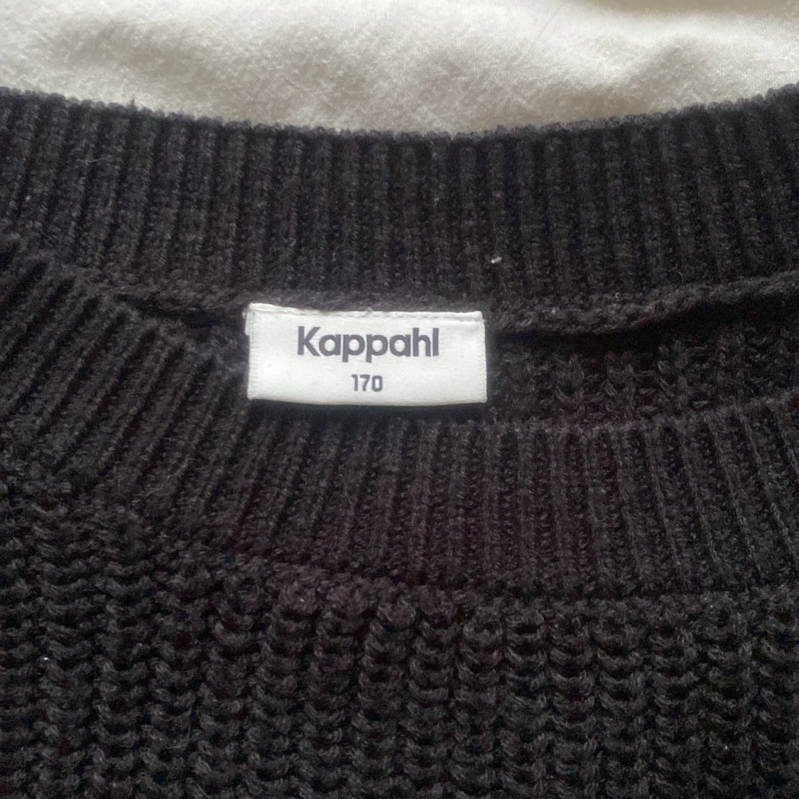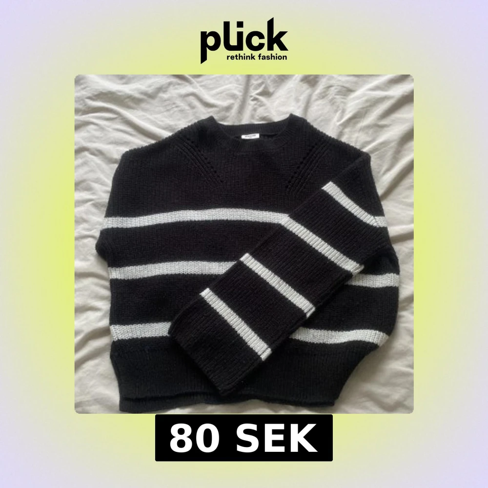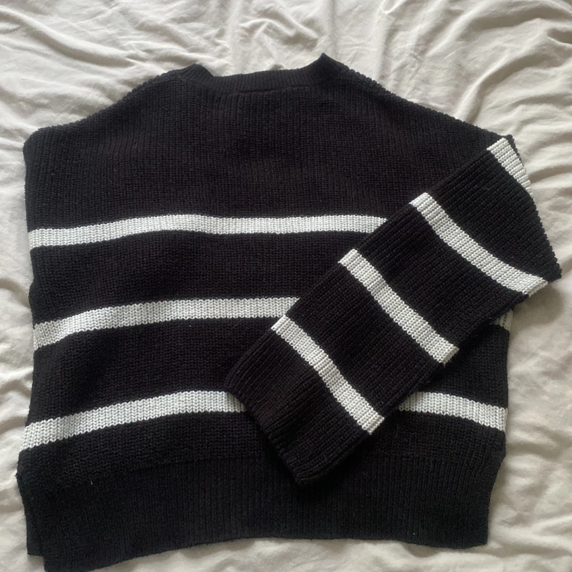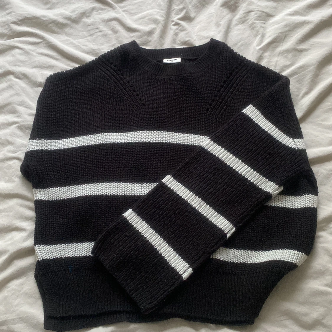 Säljer en svart stickad tröja från Kappahl med vita horisontella ränder. Tröjan har en klassisk rund halsringning och långa ärmar. Den är ribbstickad och har en lite loose passform, perfekt för lager på lager under höst och vinter.