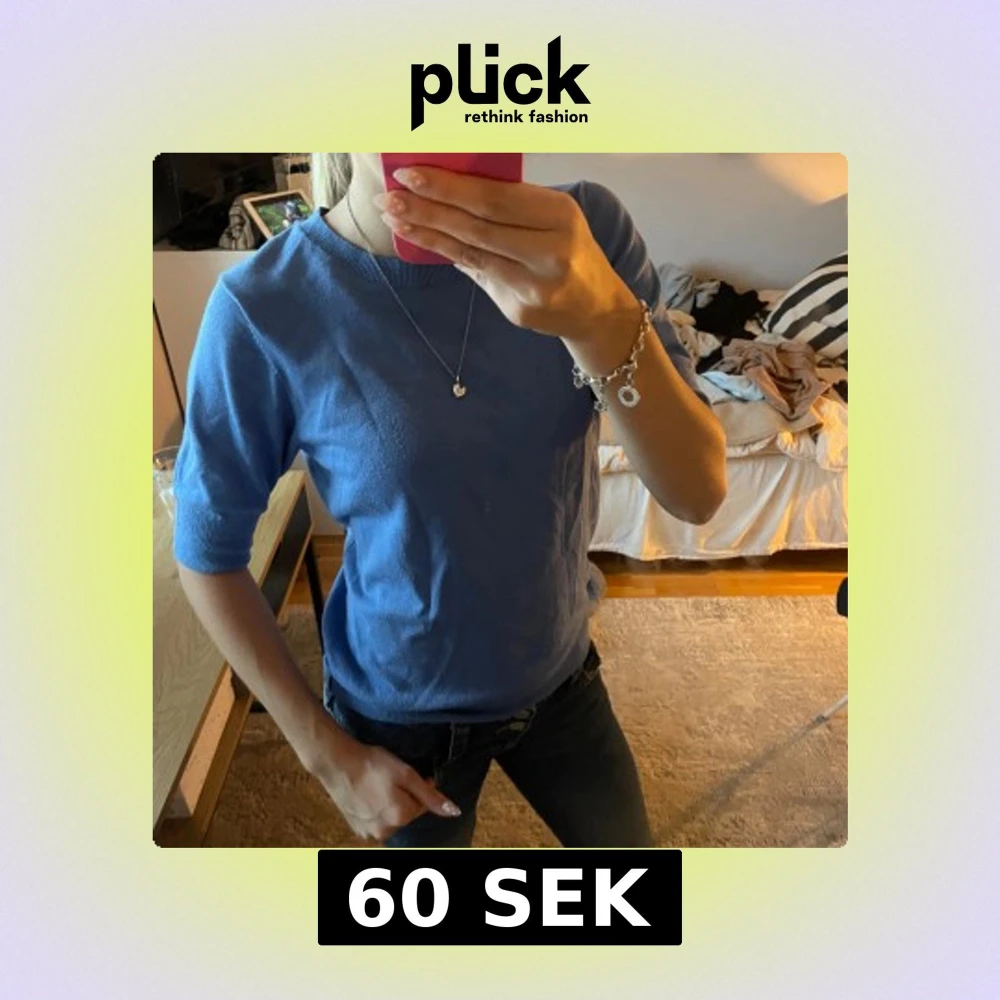 Snygg blå stickad tröja med rund halsringning och korta ärmar. Perfekt för dig som vill ha en enkel men stilren look. Tröjan har en mjuk känsla och passar bra till både jeans och kjol.