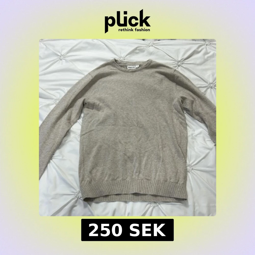 Säljer en stilren beige tröja från Kappahl i storlek S. Tröjan har långa ärmar och en rund halsringning. Perfekt för en avslappnad look. Passar bra till både jeans och chinos. Den har ett litet hål på ryggen som jag har sytt igen så att den syns inte. Pris kan diskuteras