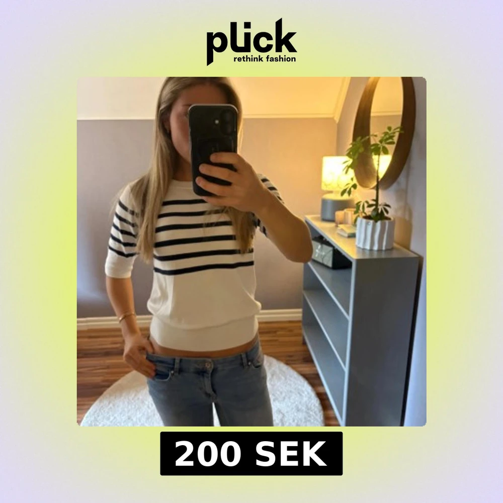 Säljer en fräsch vit tröja med marinblå horisontella ränder över bröstet och ärmarna. Tröjan har rund hals och trekvartsärm, samt en bred ribbad kant nedtill. Perfekt för dig som gillar klassisk och stilren look.