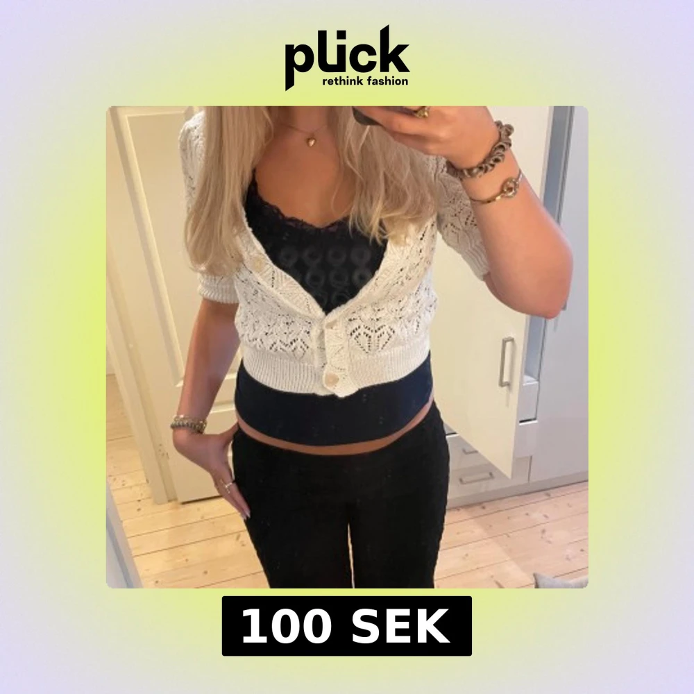 Supersöt vit stickad kofta med kort ärm och snyggt hålmönster. Croppad modell med bred ribbad kant nedtill och två stora knappar framtill💘💘
