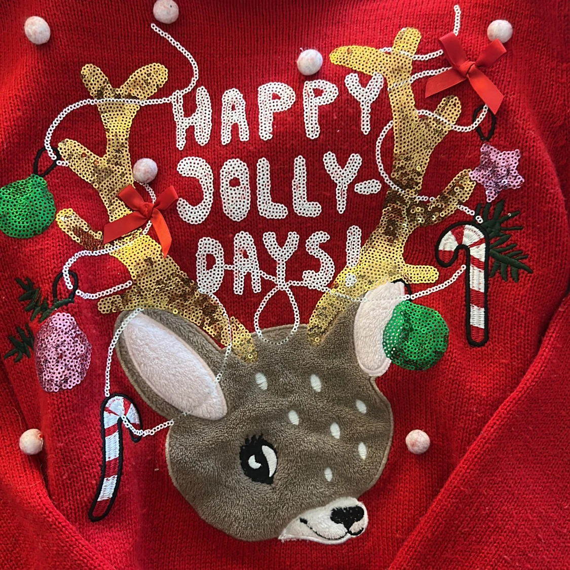 Supermysig röd stickad jultröja från KappAhl med ett gulligt renmotiv, glittriga paljettdetaljer, rosetter och texten 'Happy Jolly Days' framtill. Tröjan har långa ärmar och ribbade muddar. Perfekt för att maxa julstämningen!