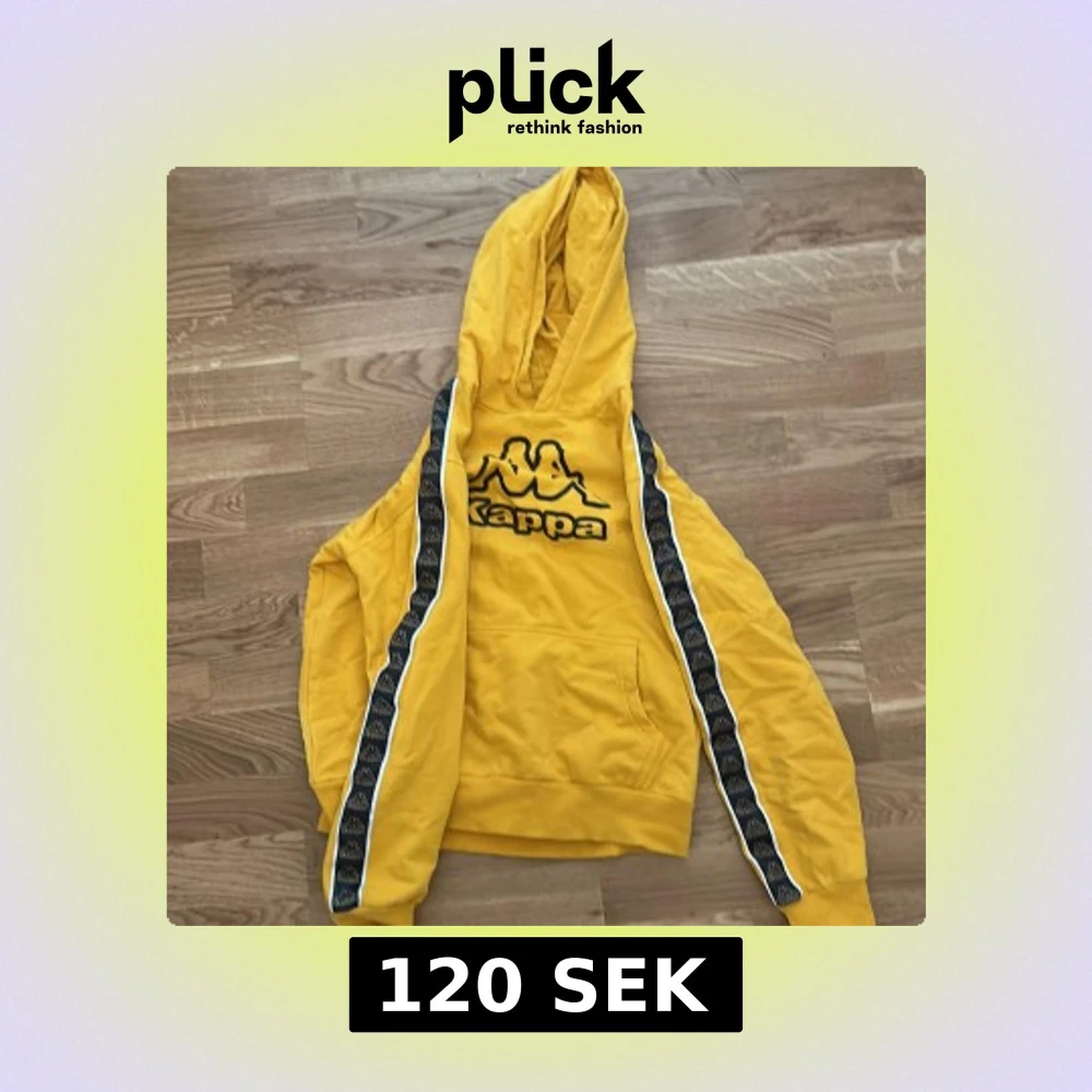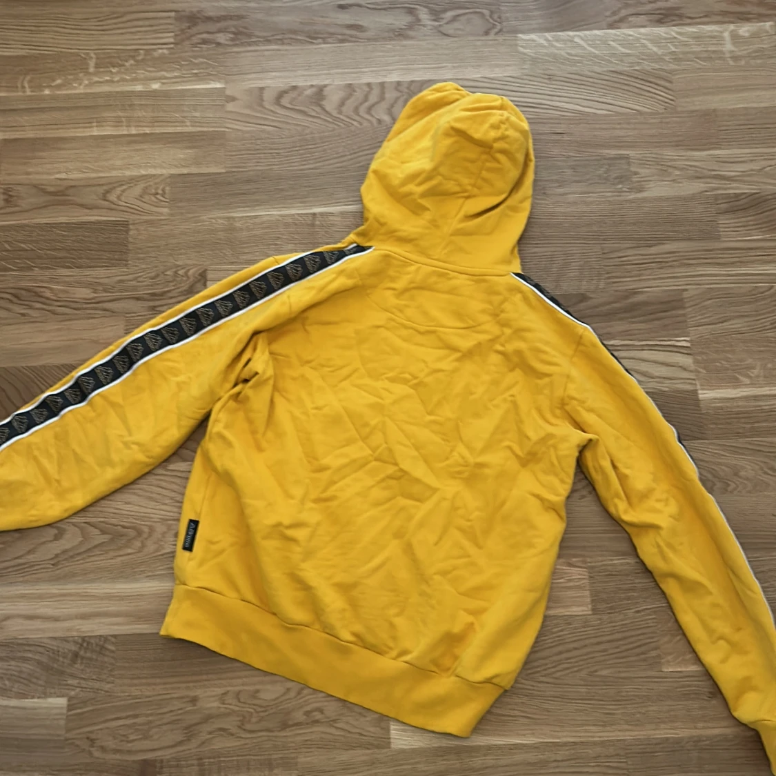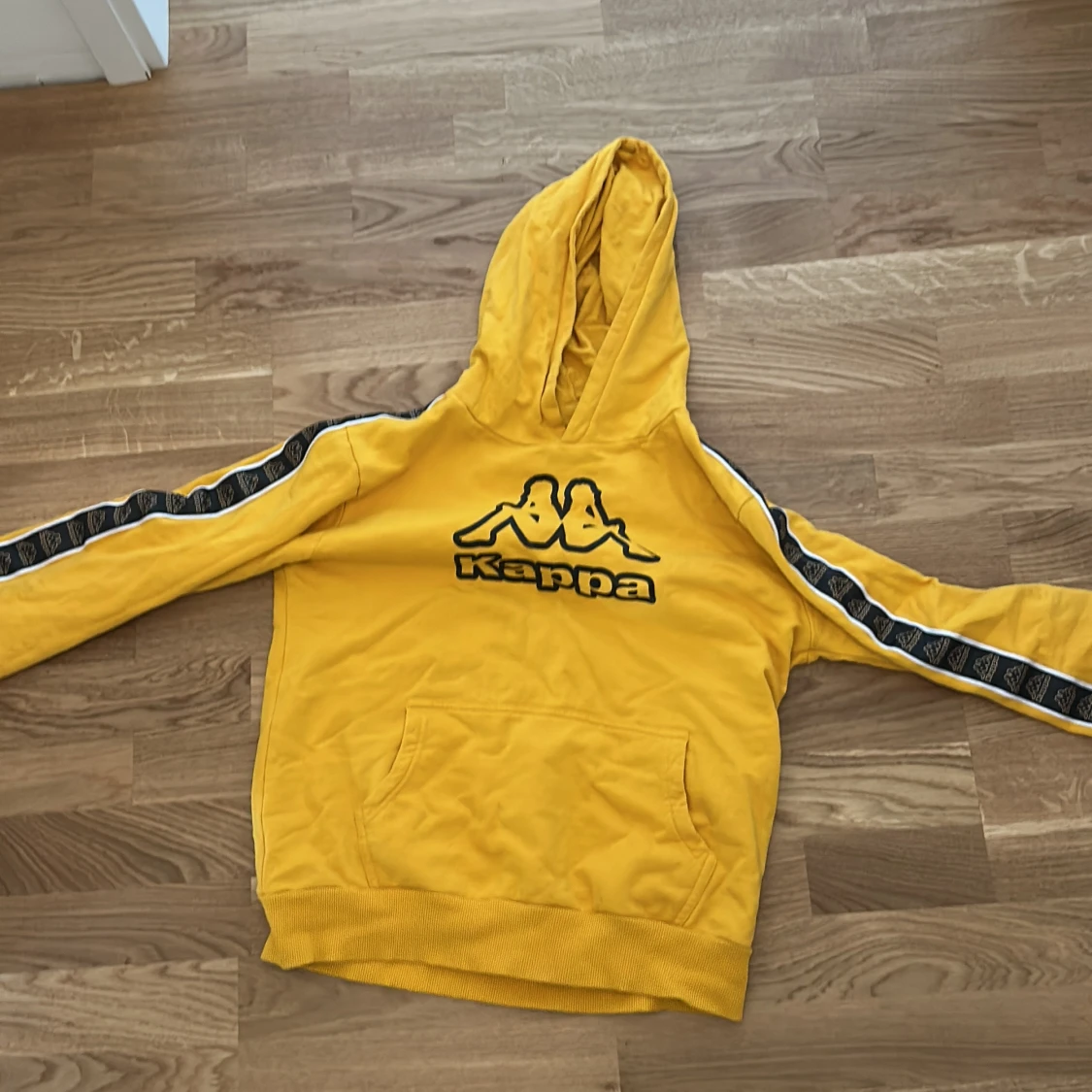 Säljer en gul hoodie från Kappa med svart och vit randig detalj längs ärmarna. Hoodien har en stor ficka framtill och en klassisk Kappa-logga på bröstet. Perfekt för en sportig look! Storleken är 14 år, storlek 162