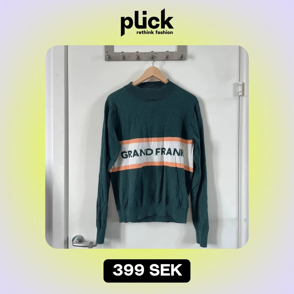 Säljer en snygg grön tröja från Grand Frank med en vit och orange rand över bröstet och texten 'GRAND FRANK'. Tröjan är i medium storlek och gjord av en mjuk blandning av bomull, kashmir och ull. Perfekt för höst och vinter!