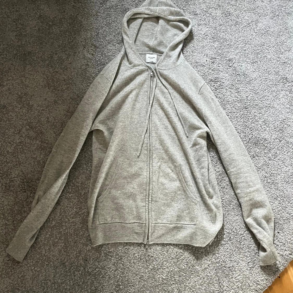 Säljer en stilren grå hoodie från John Henric med dragkedja framtill och huva med snörning. Tröjan har långa ärmar, ribbade muddar och två fickor framtill. Perfekt för en avslappnad look.