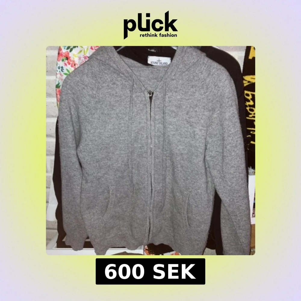 Säljer en grå Kashmir tröja från med dragkedja framtill och huva med snörning. Tröjan är stickad och har två fickor på sidorna. Perfekt för dig som gillar en clean och enkel stil. Tröjan har ett litet hål vid höger armbåge. Den har en liten fläck vid midjan men inget man tänker på. Storlek xs/s. Priset kan diskuteras