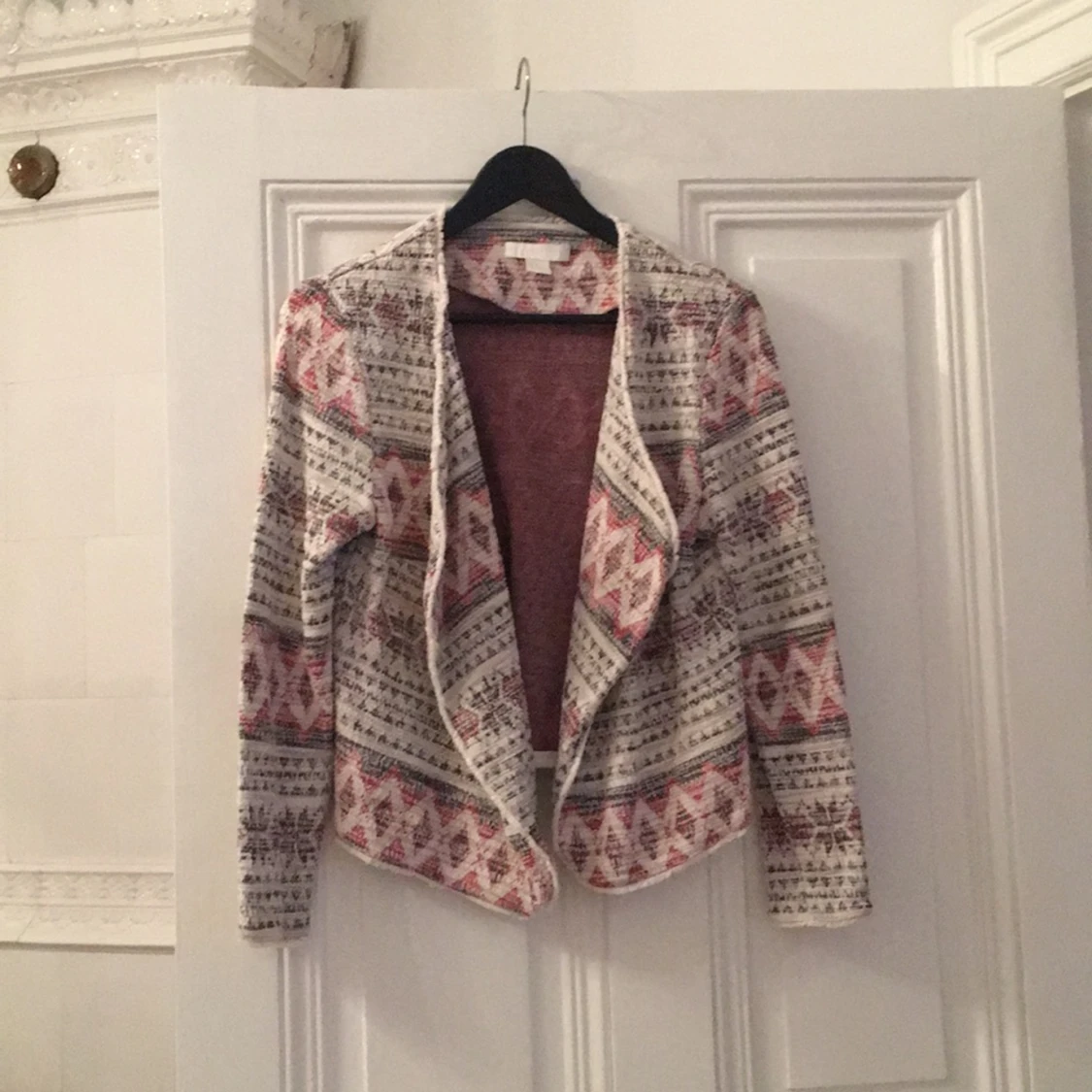 En snygg cardigan, avslappnad kavaj i fint mönster. Kavajen är i gott skick. Passar en 38-40, beror på hur du vill ha passformen. Vastastan/ Swisch föredras