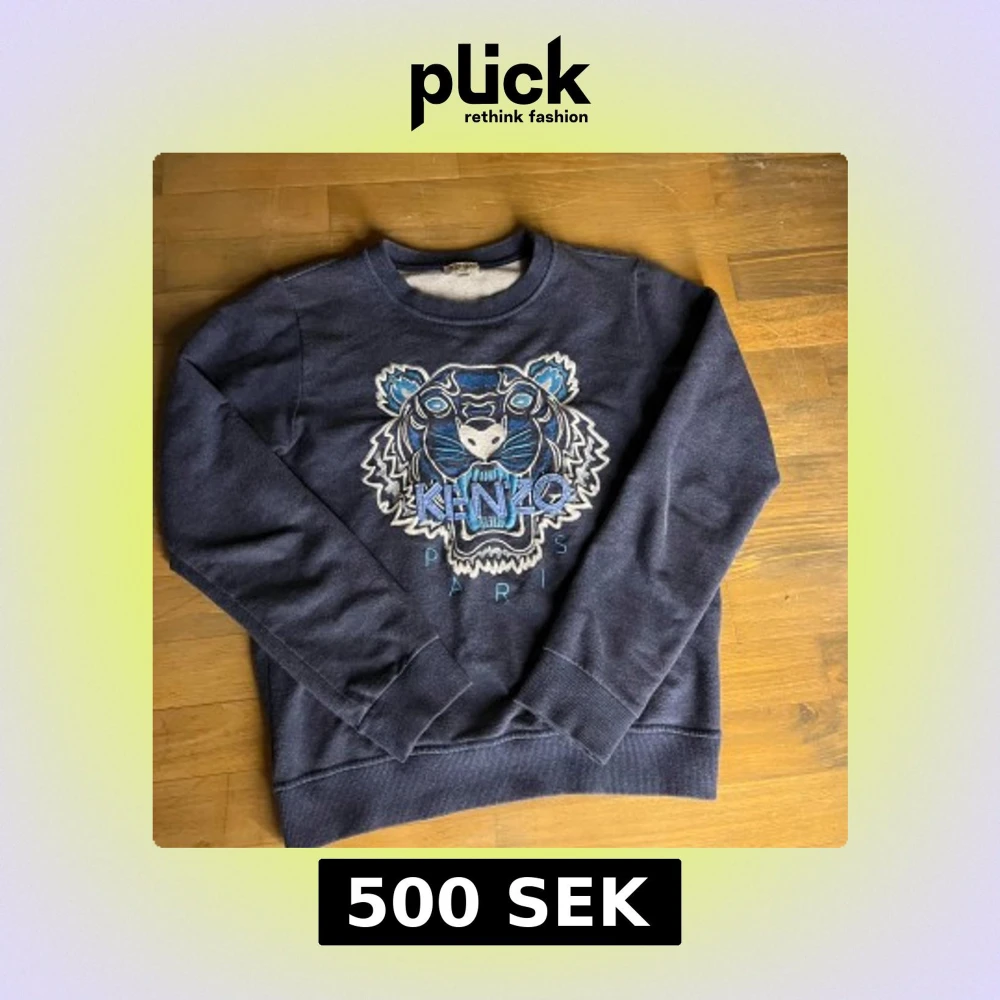 Säljer en mörkblå sweatshirt från Kenzo med ett stort broderat tigerhuvud i blått och vitt på framsidan. Tröjan har långa ärmar och en rund halsringning. Perfekt för en stilren och avslappnad look.