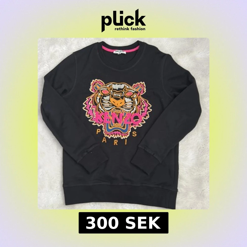 Svart sweatshirt från Kenzo med ikonisk broderad tiger och färgstarka detaljer i rosa, orange och blått. Tröjan är i 100% bomull, har rund hals och långa ärmar. Perfekt statement-plagg för dig som vill sticka ut.