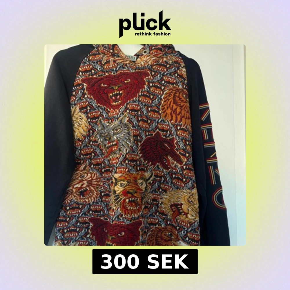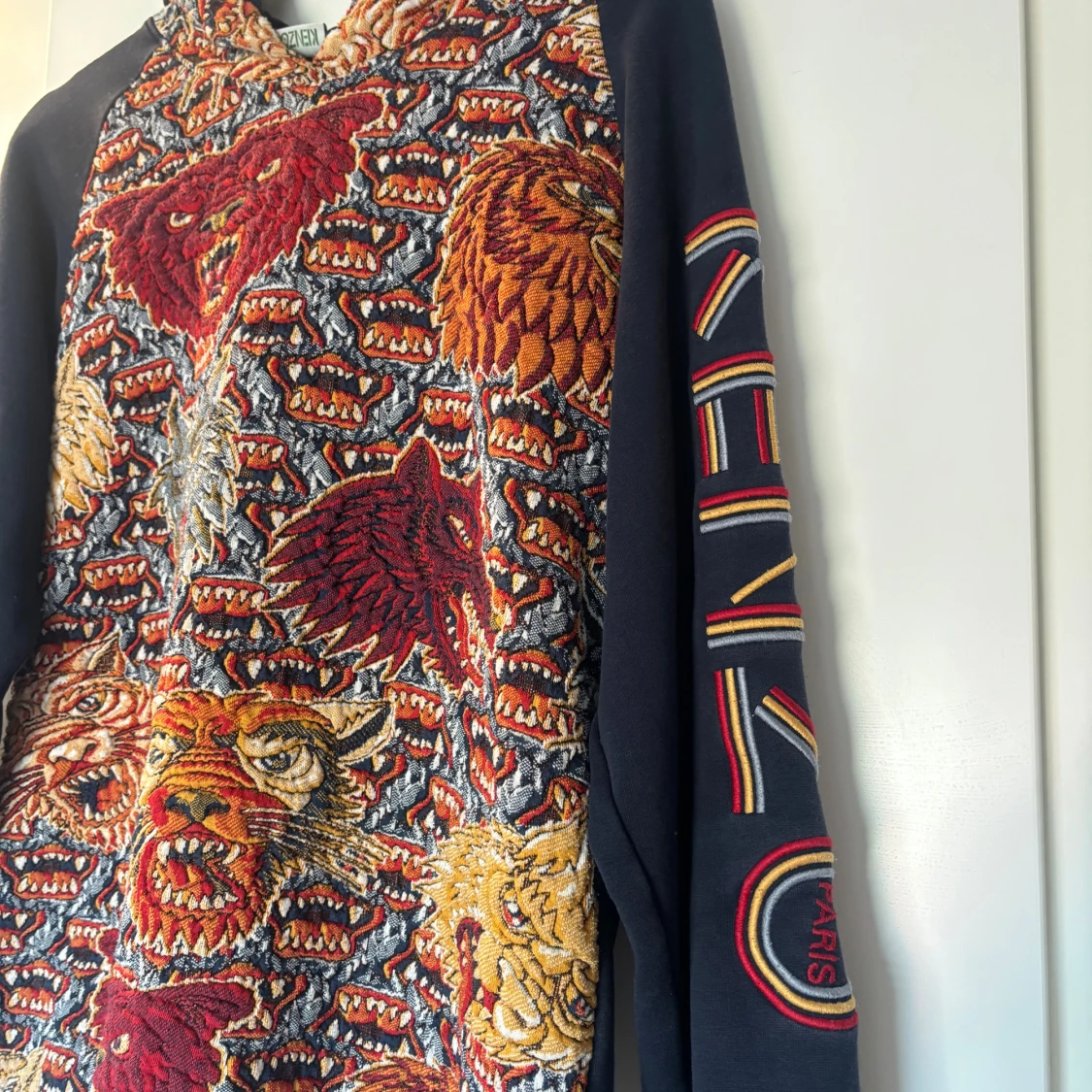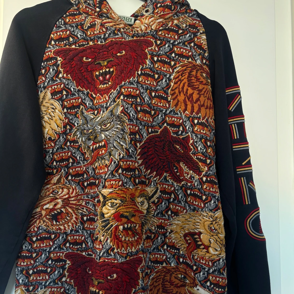 Unik hoodie från Kenzo med broderade motiv av vargar, tigrar och björnar i rött, orange, grått och beige. Svarta ärmar med Kenzo Paris-broderi i färgglada toner. Tröjan har huva och långärmad design, perfekt för dig som gillar statement-plagg.