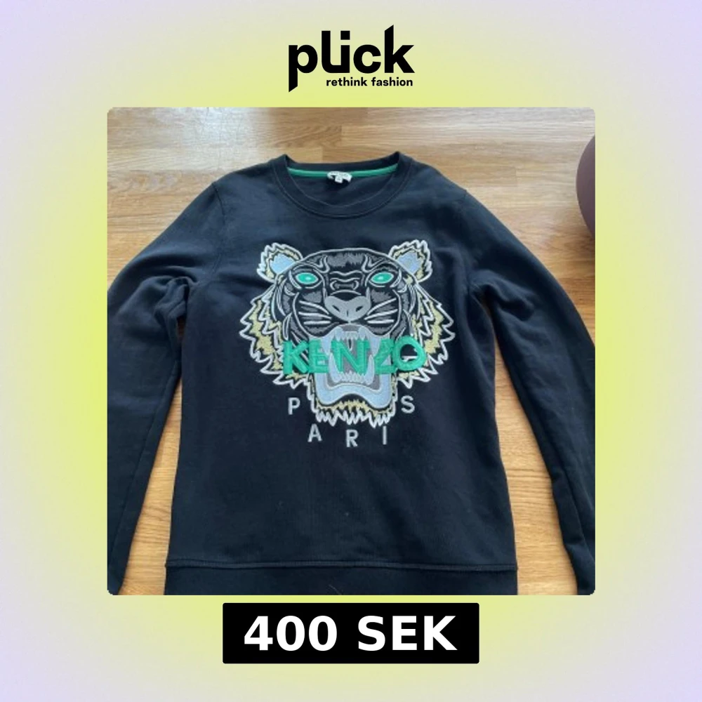 Svart långärmad tröja från Kenzo med ikoniskt broderat tigerhuvud i grått, grönt och gult framtill. Stort Kenzo Paris-tryck över bröstet. Snygg och väldigt bra skick men används tyvärr inte längre💕 storlek M men tycker den sitter som S💕 skriv om frågor eller fler bilder