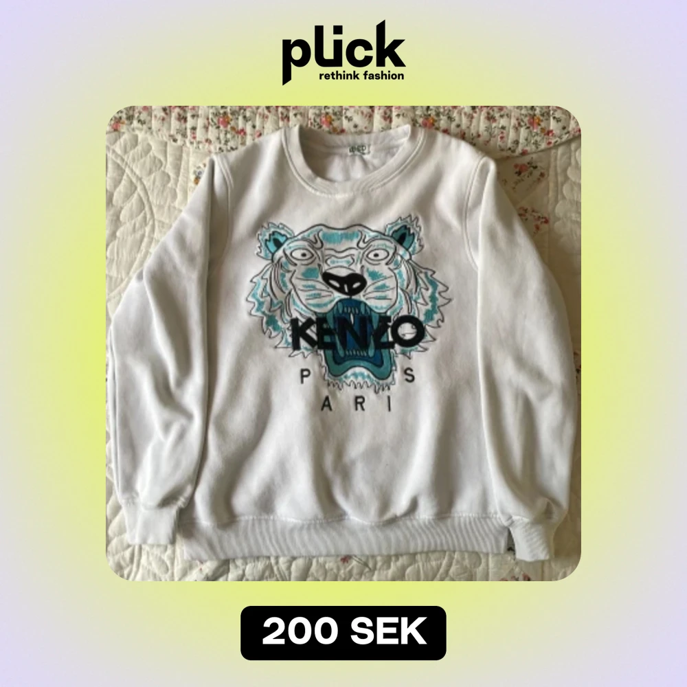 En vit kenzo tröja som är bra skick, det är annars bara lite fläckar här och där som knappt syns, står att det är storlek M när det egentligen e mot XS. Skriv innan ni köper