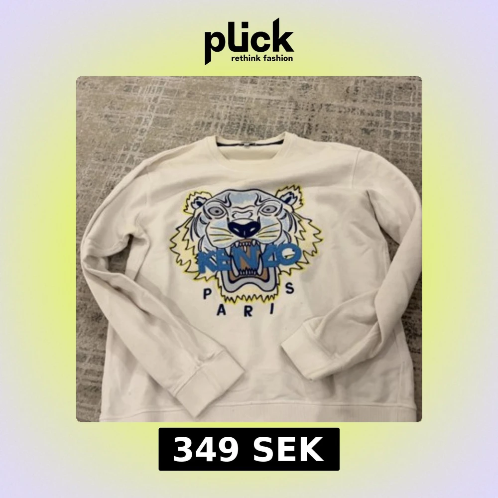 Säljer en vit sweatshirt från Kenzo med ikonisk tigerbrodyr och blått Kenzo Paris-tryck på bröstet. Tröjan har rund halsringning och långa ärmar. Perfekt statement-plagg för dig som gillar streetwear och snygga detaljer.