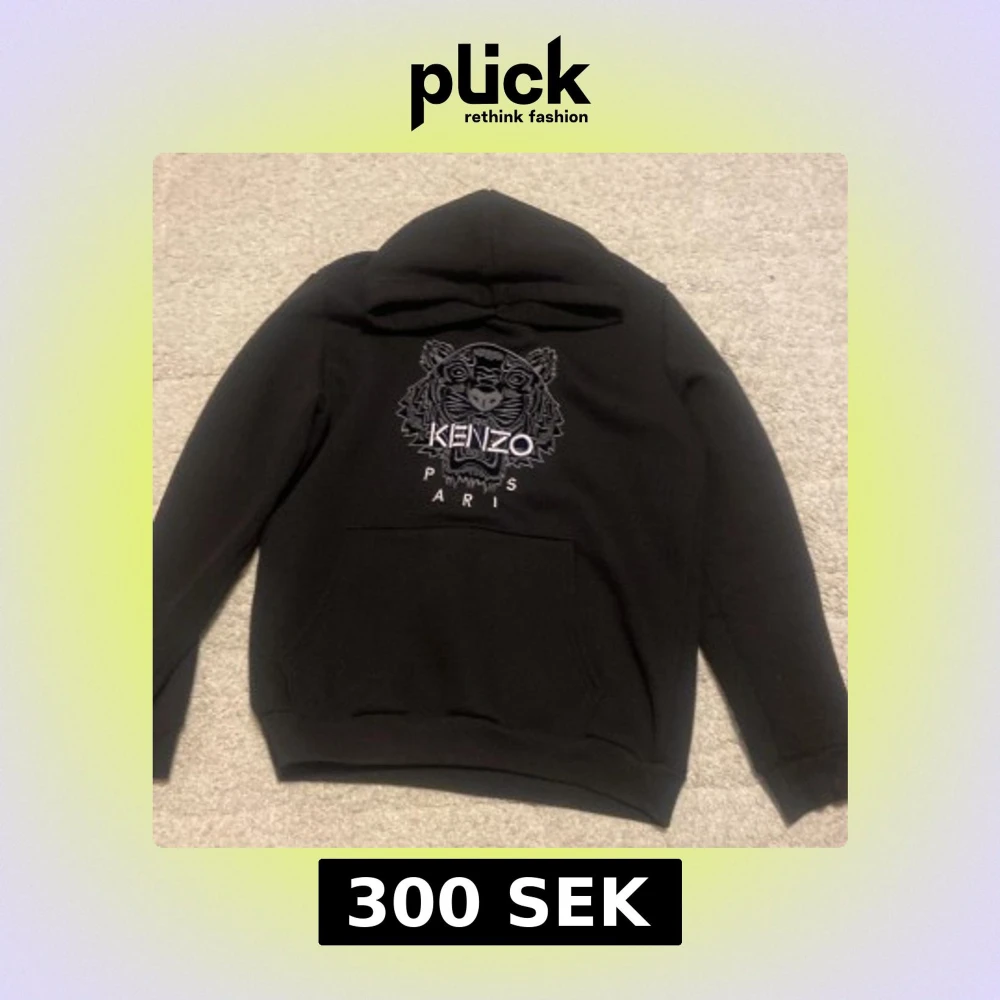 Svart hoodie från Kenzo med ikoniskt tigerbroderi och Kenzo Paris-text på bröstet. Tröjan har huva, magficka och långa ärmar. Materialet är mjukt och känns som bomull, perfekt för chill dagar. Snygg och stilren design som sticker ut med detaljerad brodyr.