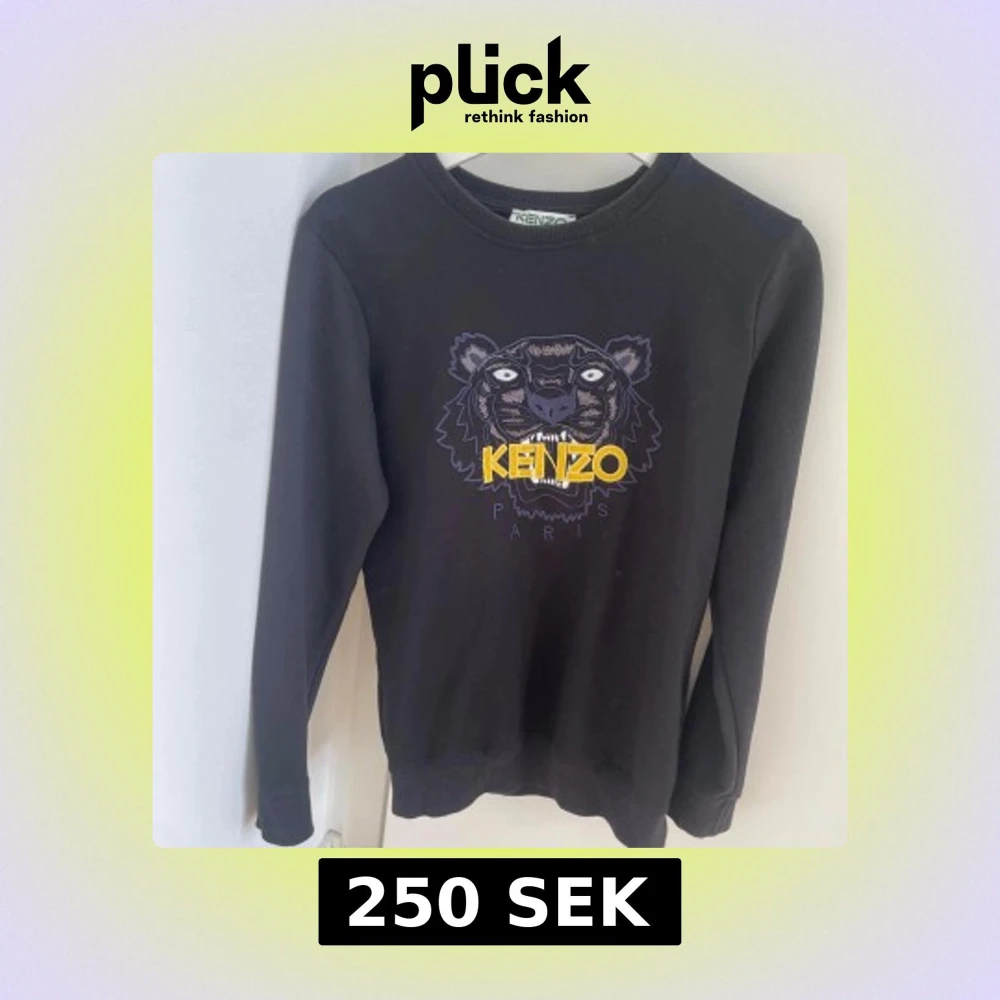 Svart sweatshirt från Kenzo med ikoniskt broderat tigerhuvud och gult Kenzo Paris-tryck på bröstet. Tröjan har rund hals, långa ärmar och ribbade muddar. Perfekt för dig som vill sticka ut med en streetstyle-look. Passar S/xs tun tröja