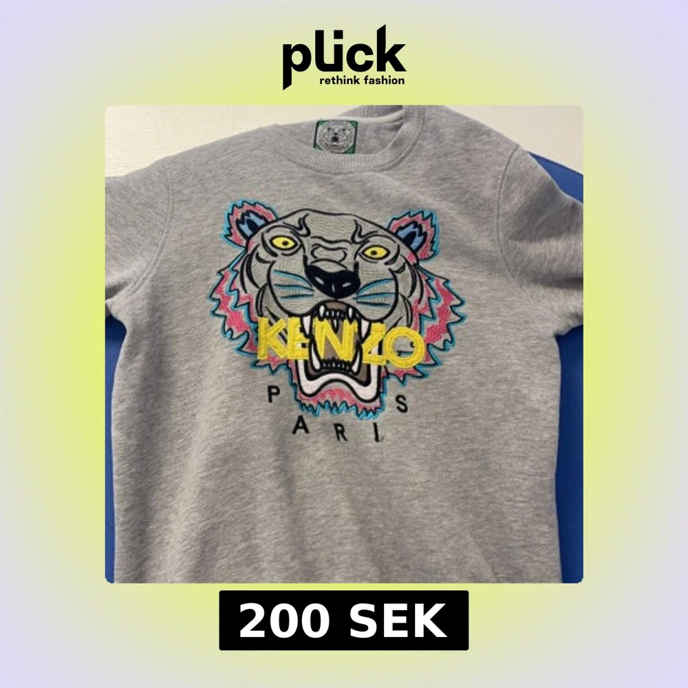 Säljer en grå sweatshirt från Kenzo med ett stort, färgglatt tigerbroderi på framsidan. Tröjan har rund hals och är kortärmad. Perfekt för en cool och avslappnad stil.