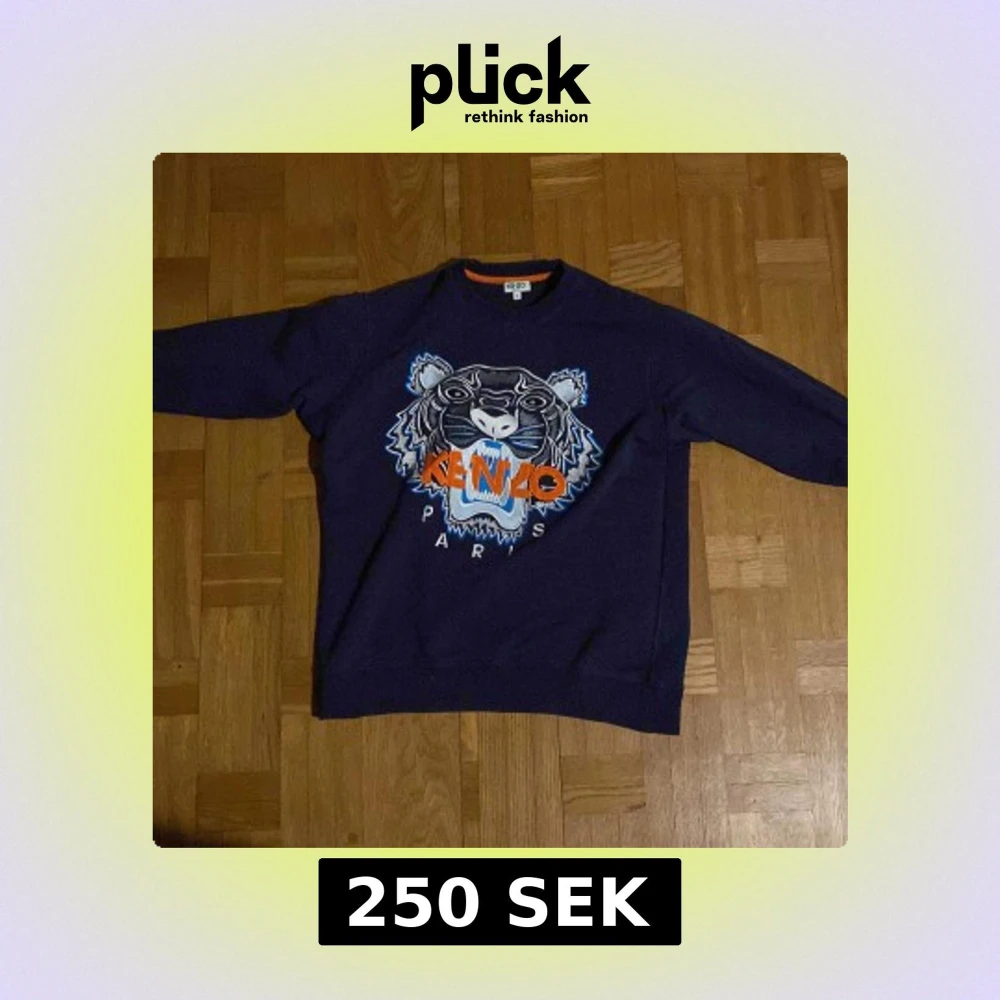 Säljer en mörkblå tröja från Kenzo med ett stort, broderat tigerhuvud i flera färger på framsidan. Tröjan har långa ärmar och en rund halsringning med orange detalj på insidan. Perfekt för en cool och avslappnad stil.