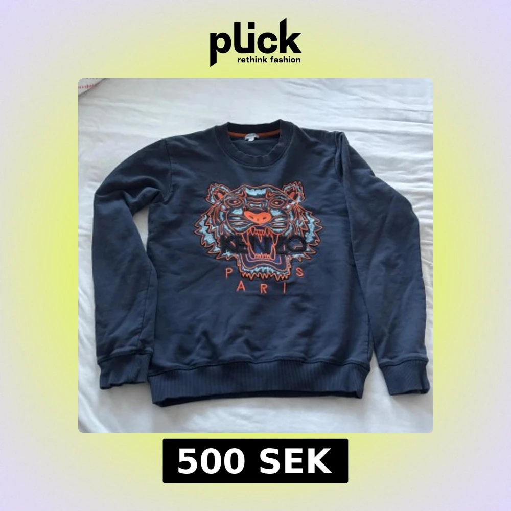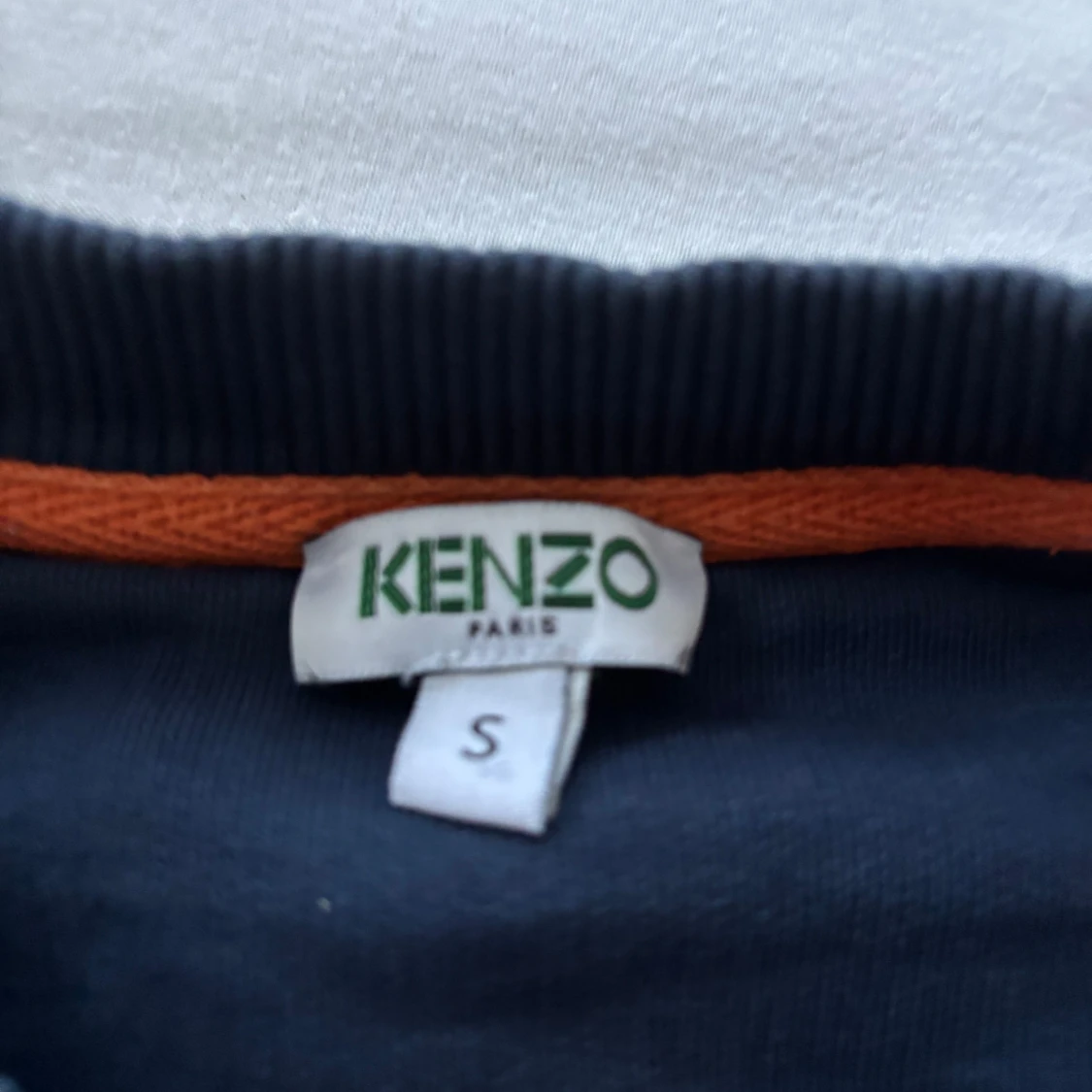 Säljer en mörkblå sweatshirt från Kenzo med ikoniskt broderat tigerhuvud och Paris-text i orange och blått framtill. Tröjan har rund hals, ribbade muddar och är långärmad. Perfekt statement piece för dig som gillar streetstyle. Äkta!
