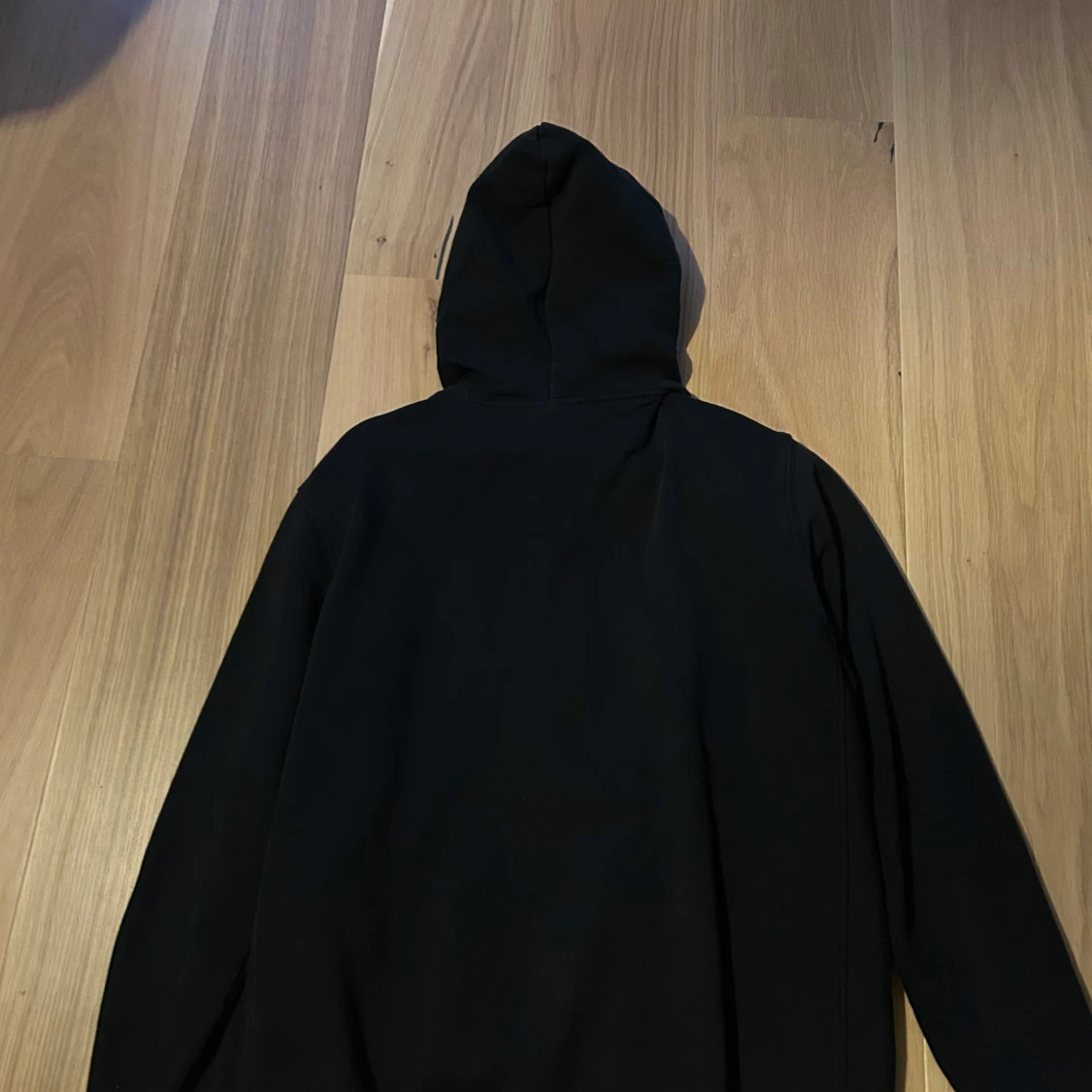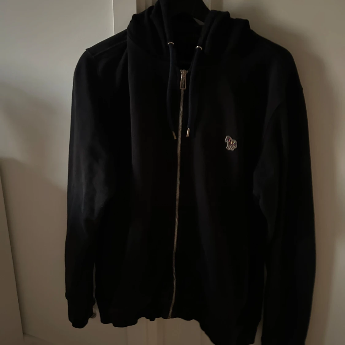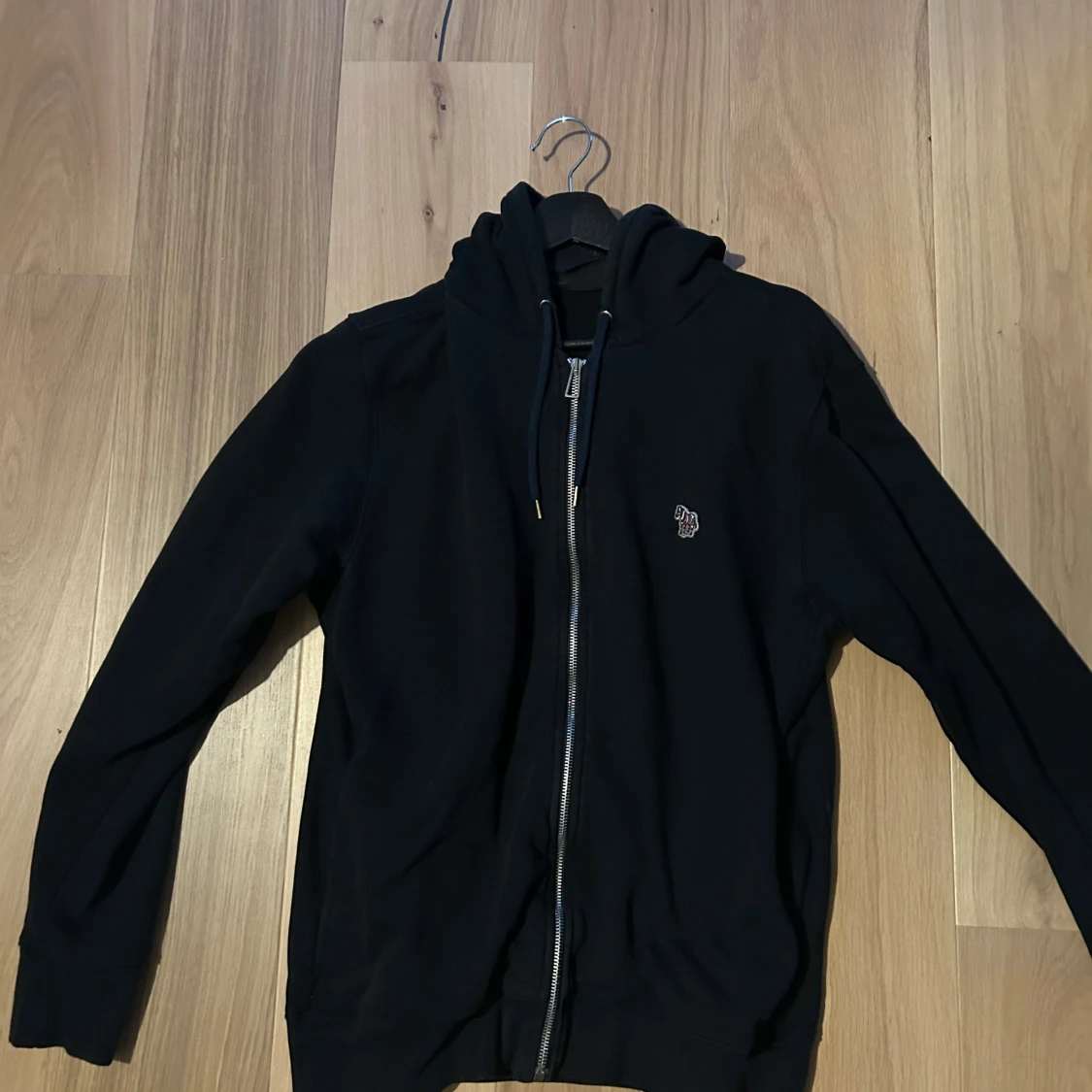 Svart hoodie från Paul & Smith med dragkedja framtill och huva med snörning. Liten broderad tigerlogga på bröstet. Tröjan har långa ärmar och ribbade muddar. Perfekt för chill dagar och streetwear-stil.