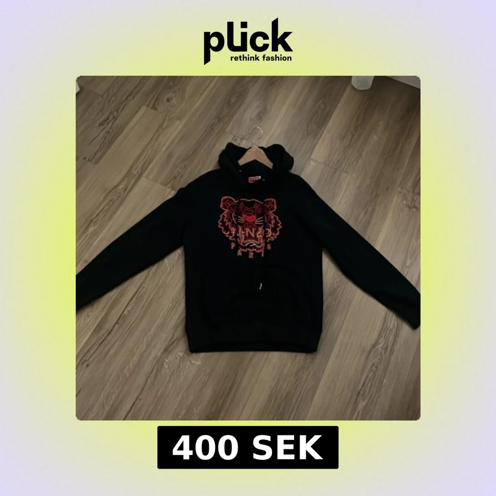 Svart hoodie från Kenzo i storlek XL med ikonisk tigerbrodyr i rött och rosa på bröstet. Tröjan har huva med snörning och en klassisk känguruficka framtill. Perfekt statement-plagg för dig som vill sticka ut.