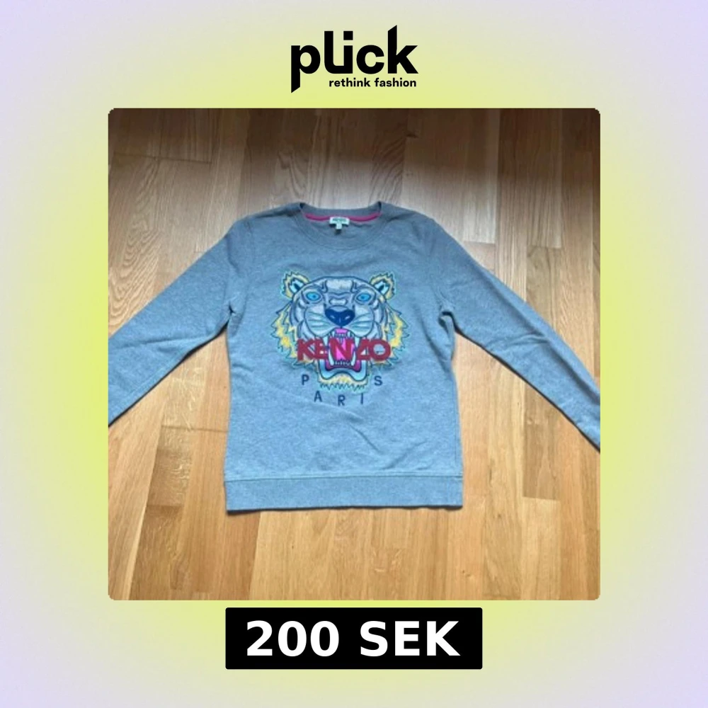 Säljer en grå sweatshirt från Kenzo med ett färgglatt tigerbroderi på framsidan. Tröjan har långa ärmar och en rund halsringning med rosa detaljer på insidan. Perfekt för en avslappnad stil.