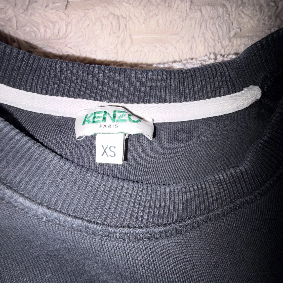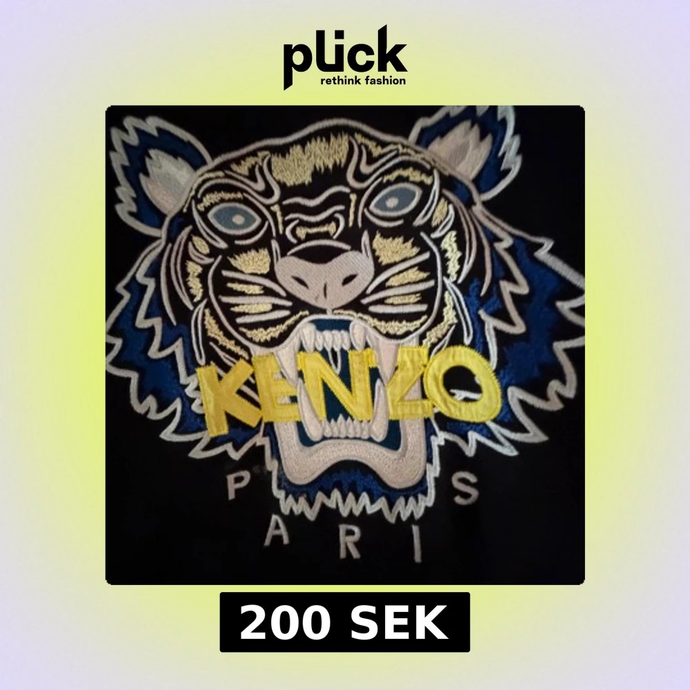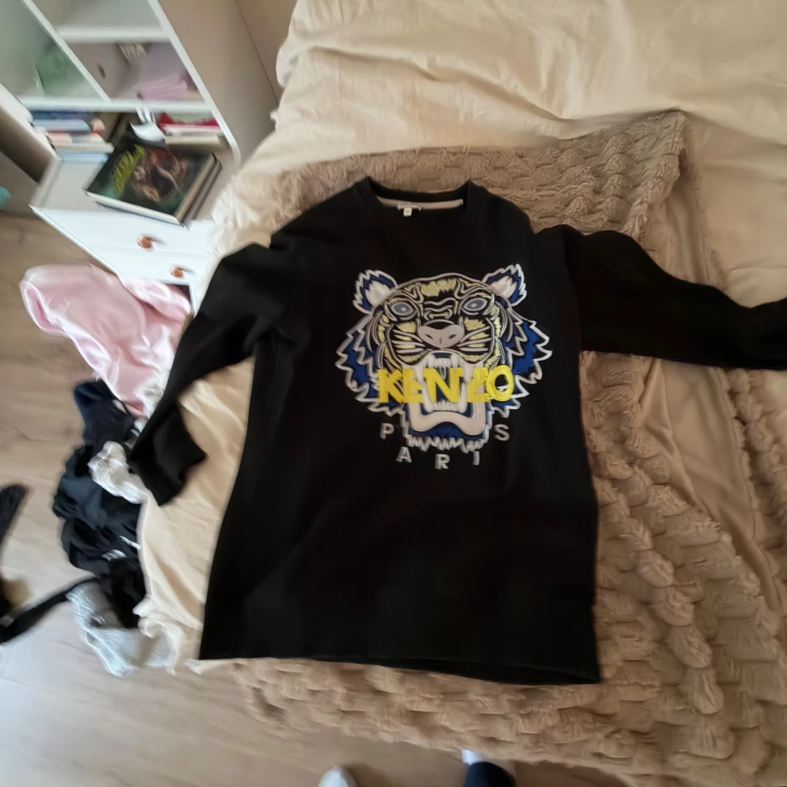Svart sweatshirt från Kenzo i storlek XS med ikonisk broderad tiger på bröstet i blått, gult, vitt och grått. Tröjan har rund hals, ribbade muddar och lång ärm. Perfekt statement-plagg med coolt Paris-tryck under tigern.