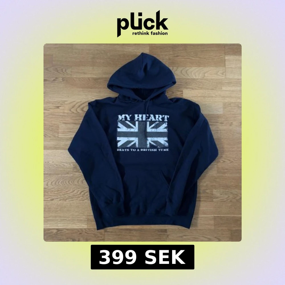 Snygg mörkblå hoodie med huva och känguruficka. På bröstet finns ett stort tryck med brittiska flaggan och texten 'MY HEART BEATS TO A BRITISH TUNE'. Perfekt för dig som gillar streetstyle och vill sticka ut lite extra.