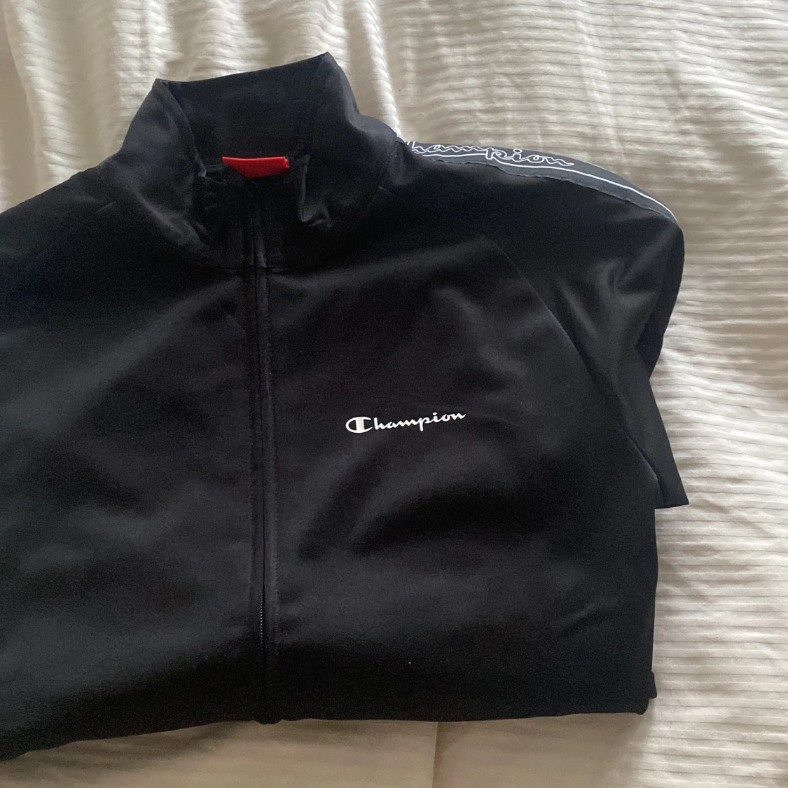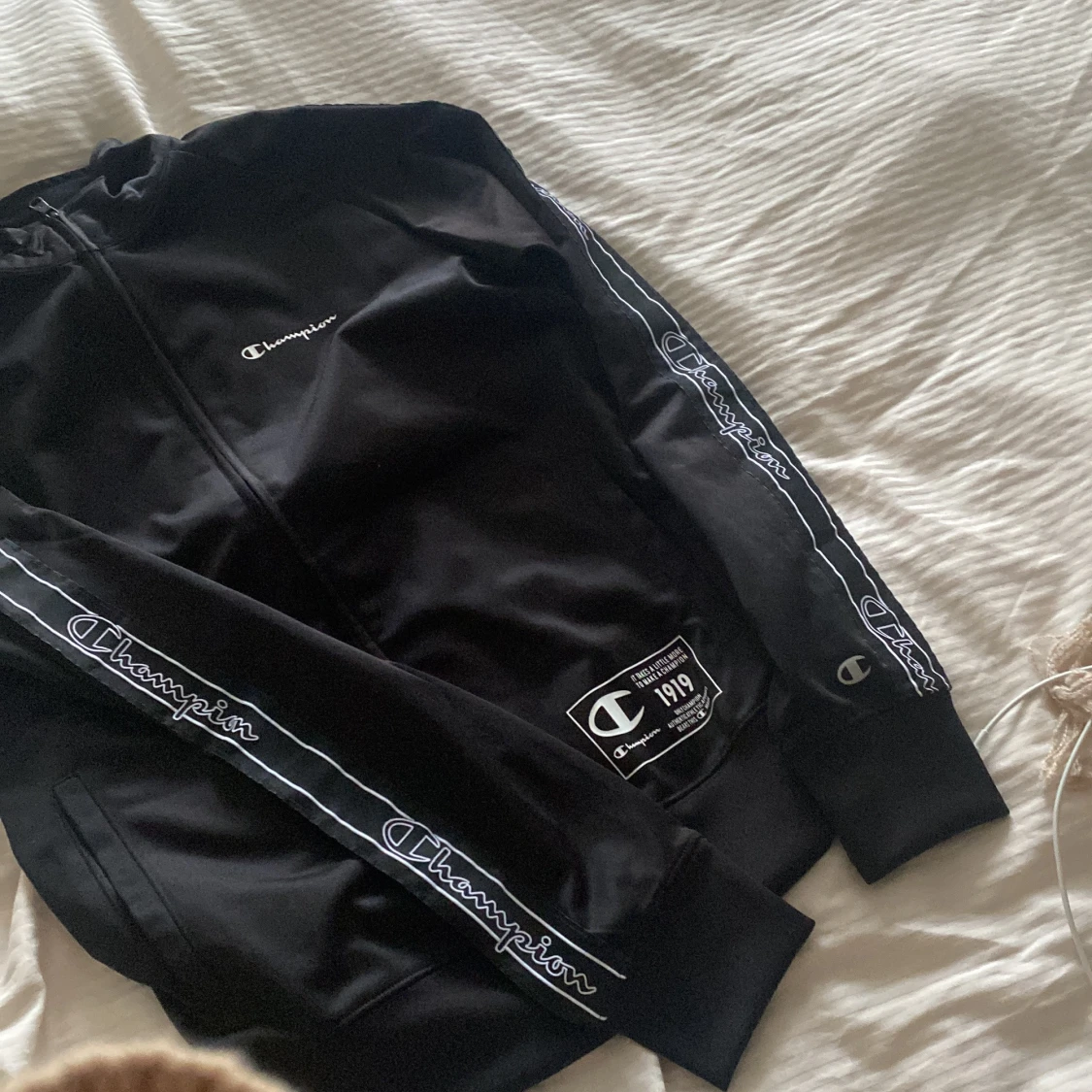 en svart champion siphoodie utan luva. väldigt fina skick och fina detaljer på ärmarna. skriv för fler bilder. storlek small