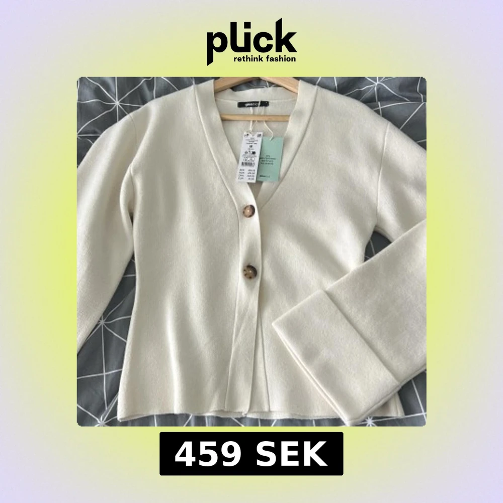 Vit kofta från Gina Tricot med v-ringning och bruna knappar framtill. Koftan har långa ärmar med breda muddar och är tillverkad av mjuk stickad polyesterblandning, varav 51% är återvunnen polyester. Perfekt för lager-på-lager och enkel att matcha.