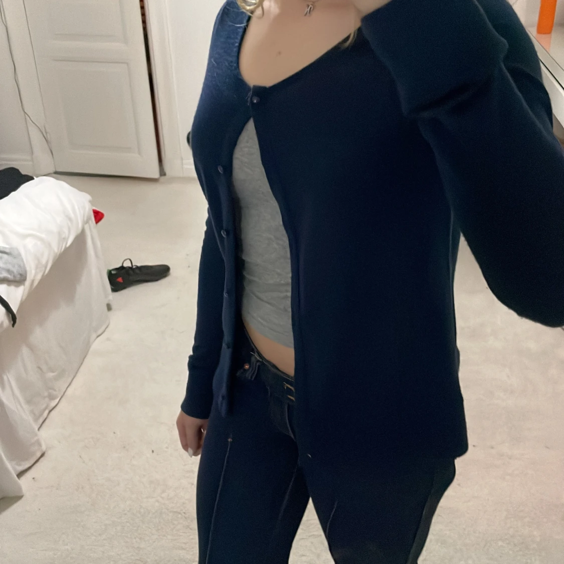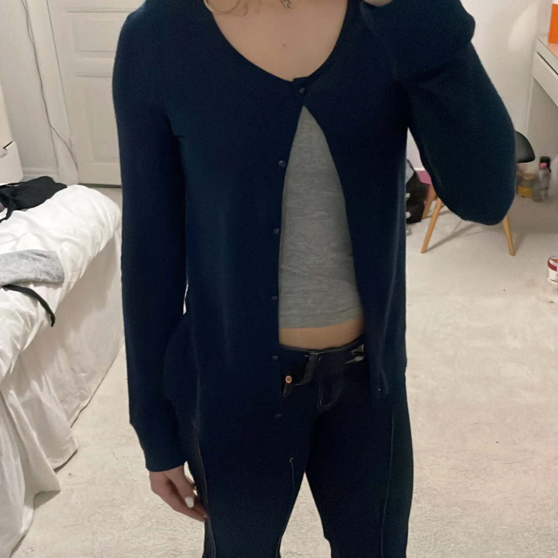 Säljer en stilren mörkblå kofta med knappar framtill. Koftan har en u-ringad design och långa ärmar, perfekt för en avslappnad look.