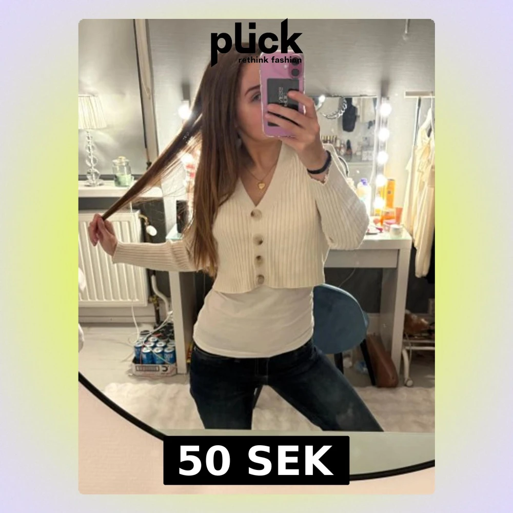 Säljer en kort, ribbad kofta i vit färg med v-ringning och stora dekorativa knappar framtill. Koftan har lång ärm och är croppad i modellen, perfekt att slänga över ett linne eller t-shirt. Enkel och stilren design som man kan ha till precis allting.❣️