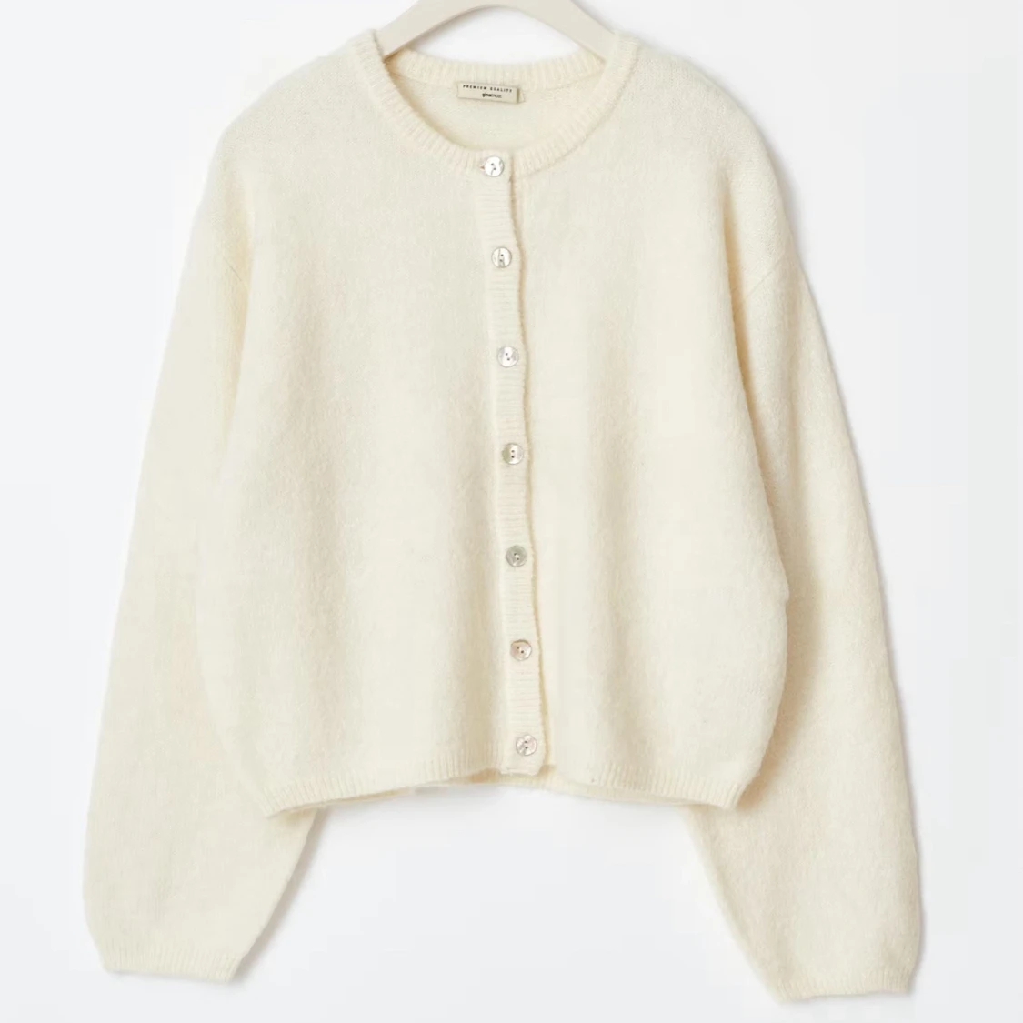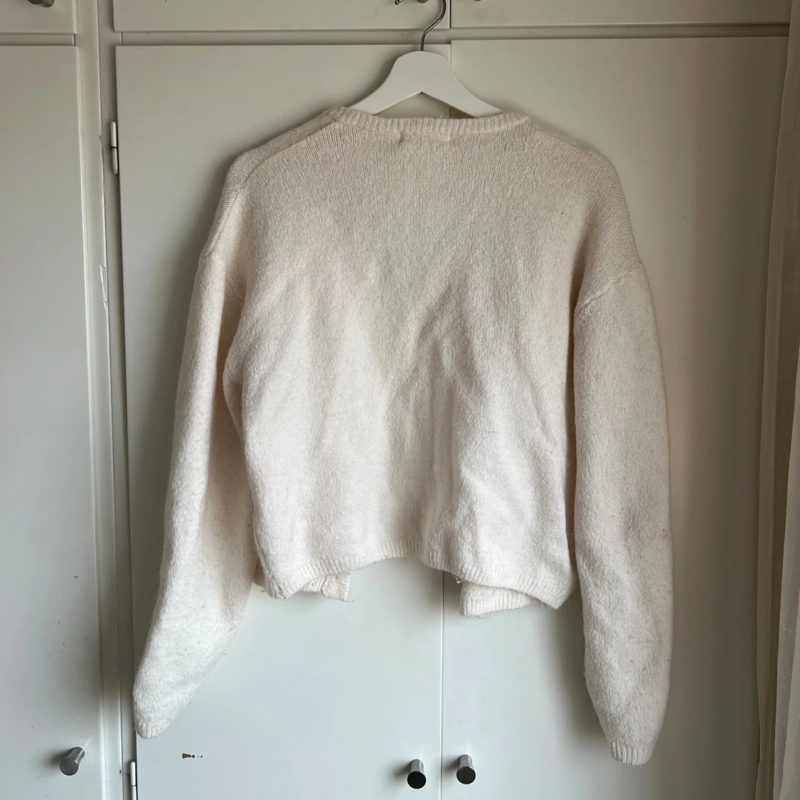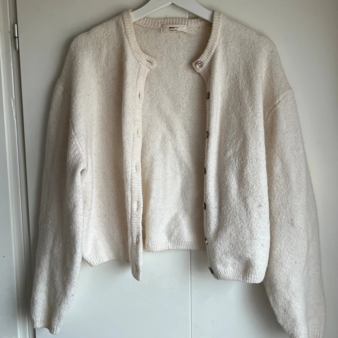 Supermysig vit/offwhite kofta från ginatricot i storlek XS. Helt slut såld på hemsidan. Stickad kofta med knappar fram. Cardigan är vit och har lös passform. Den har lång ärm, rund halsringning och ribbstickad nederkant