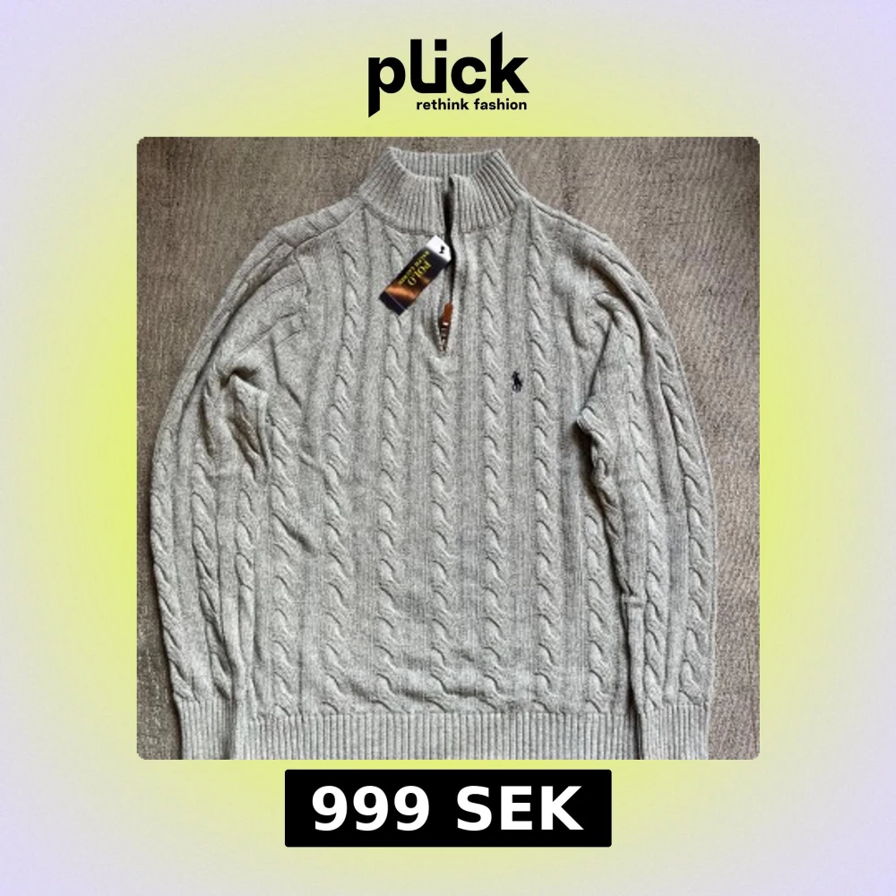 OBS! XL men passar bäst om du är L. Säljer en stilren grå stickad tröja från Ralph Lauren med dragkedja och kabelstickat mönster. Tröjan har långa ärmar och en liten broderad logga på bröstet. Perfekt för kyliga dagar!
