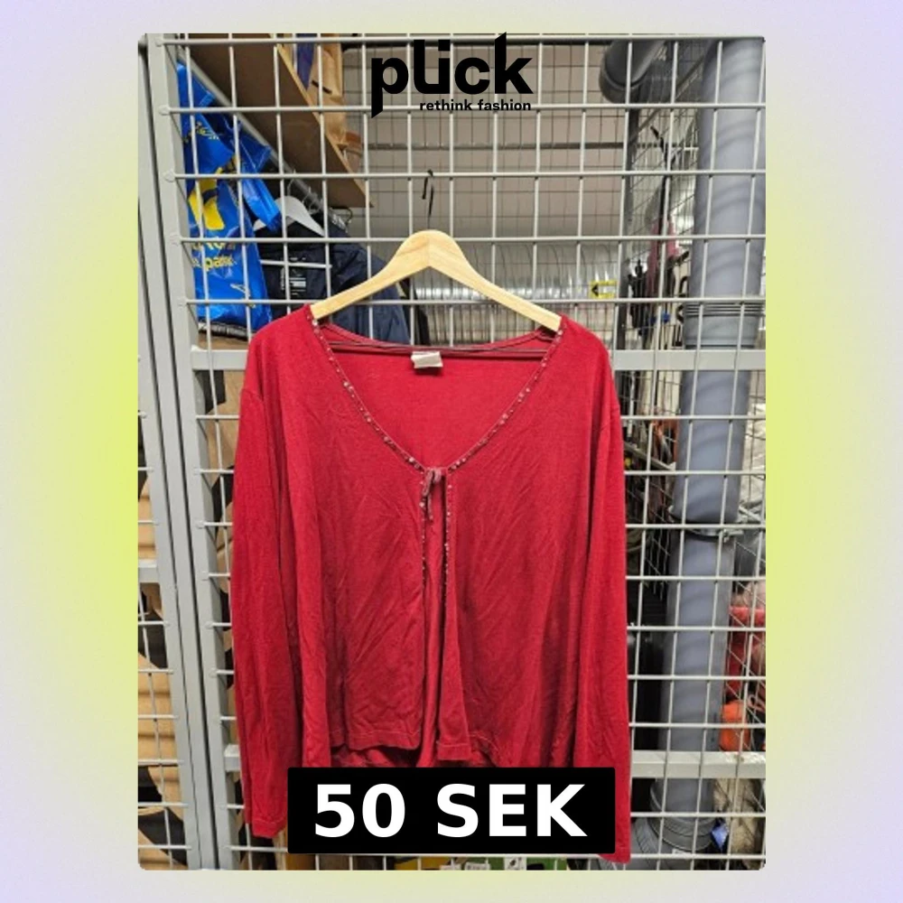 Röd kofta i viskosmix med långa ärmar och v-ringning. Dekorerad med små paljetter längs kanten och ett snyggt knyt framtill. Perfekt för dig som vill ha något extra till din outfit.