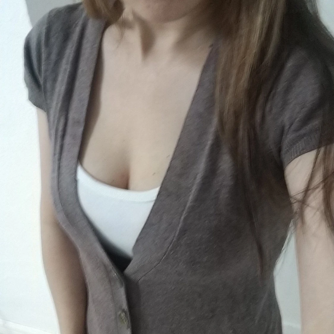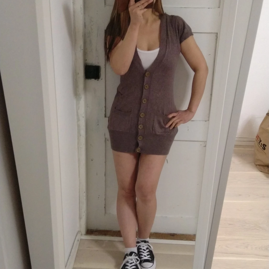 En lång kofta. Det står L på etiketten men det passar mig som är en xs.
