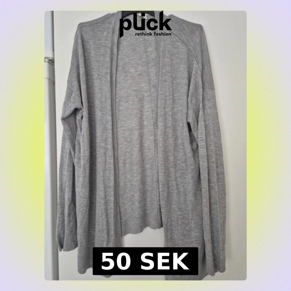 Säljer en enkel och mjuk grå kofta från H&M i storlek S. Koftan har lång ärm, öppen framtill och är tillverkad i ett tunt stickat material. Perfekt att slänga över en t-shirt eller linne när det är lite kyligt ute.