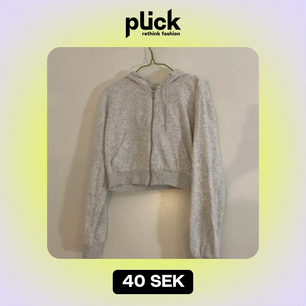 En grå kort kofta med luva. Den ser lite mörkare ut på bilden än vad den är i verkligheten