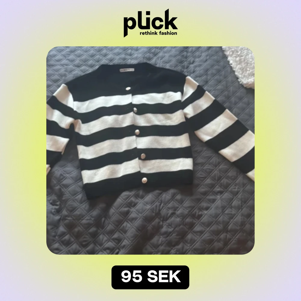 Randig vit,svart tröja som man knäpper. Knapparna är glansiga och silvriga. Aldrig använd.